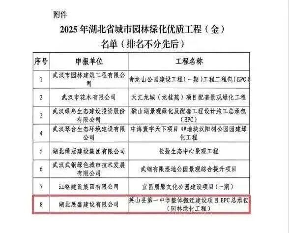 近日,湖北省风景园林学会发布“2025年度湖北省城市园林绿化优质工程”评选结果,英山县第一中学园林绿化工程项目和英山县中央公园(一期)项目分别荣获优质工程金奖和优质工程奖,将于12月28日在湖北省第四届(鄂州)园博会开幕式上举行颁奖仪式。