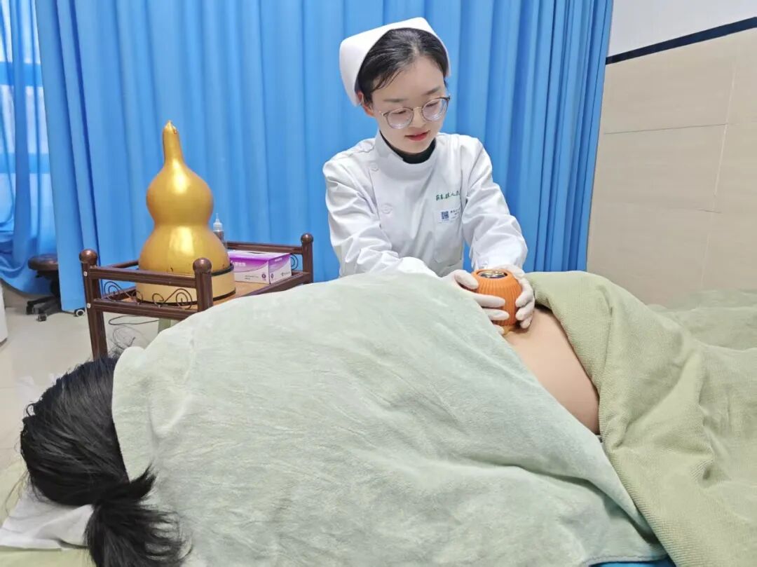 治疗开始前,特色门诊护理人员先顺着督脉、膀胱经为她推揉风府至大椎、风池至肩井等穴位,把紧绷的经络慢慢梳理开。随后,带着艾灸温热的火龙罐在颈肩背部缓缓运走,点、叩、推、揉……手法娴熟又轻柔,罐体的温热感一点点渗进肌肉里。