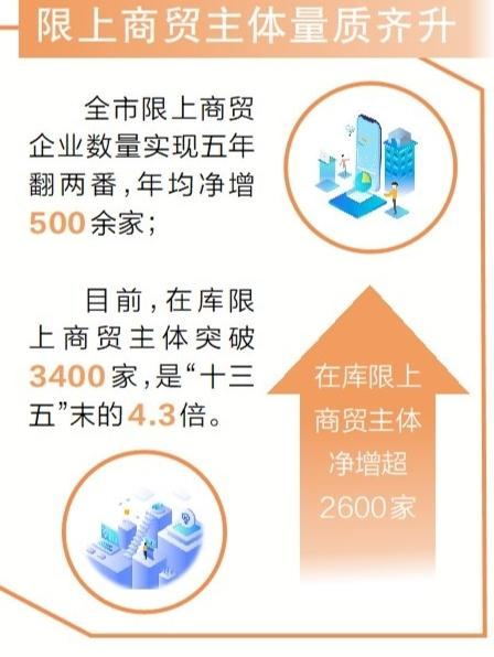 “十四五”期间,我市多措并举培育壮大市场主体,推动限上商贸主体实现量质齐升。全市限上商贸企业数量实现五年翻两番,年均净增500余家。目前,在库限上商贸主体突破3400家,是“十三五”末的4.3倍,净增超2600家。