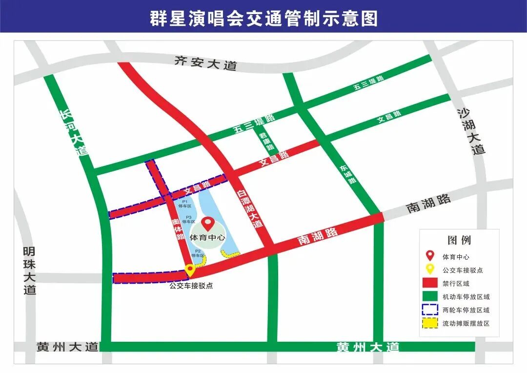 文昌路(长河大道-白潭湖大道)段;南湖路(长河大道-奥体路)段;奥体路(五三堤路-文昌路)段,允许观看演出的两轮电动车、摩托车沿道路两侧按执勤人员指挥有序停放。