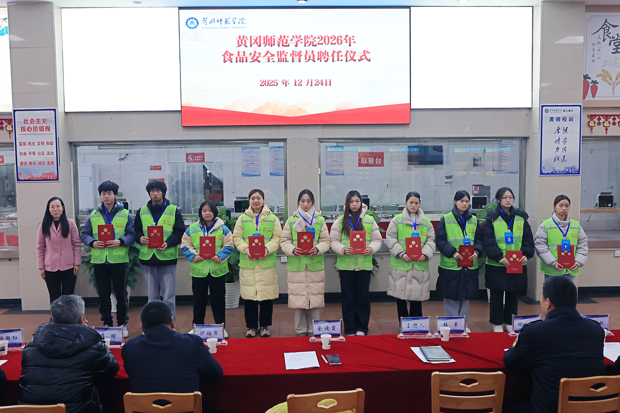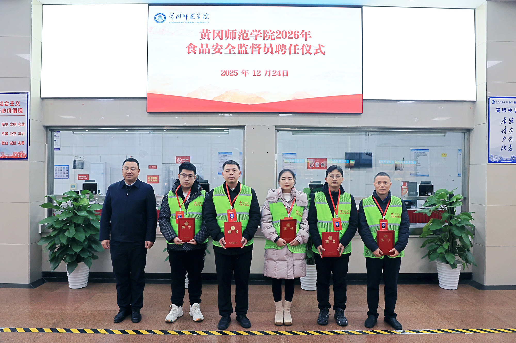 黄冈日报讯 (记者张松林 通讯员蔡锋)12月24日,黄冈师范学院举行2026年食品安全监督员聘任仪式,该校5名教师和10名学生接过聘书、正式挂牌“上岗”,将化身校园食品安全的“监督员”“宣传员”,为师生饮食安全筑牢防线。