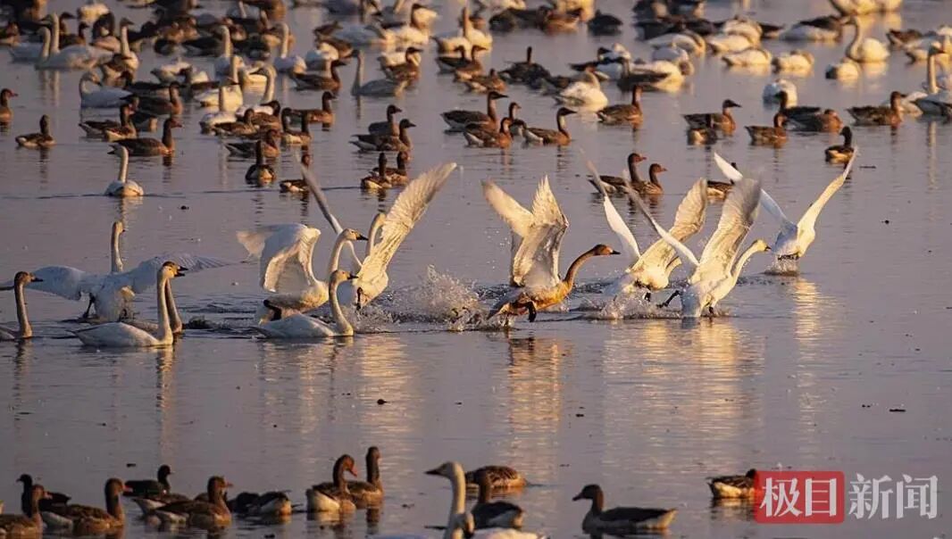 黄梅龙感湖,冬候鸟或静卧湖面,或展翅高飞,呈现一幅自然和谐的生态美景(朱熙勇摄)