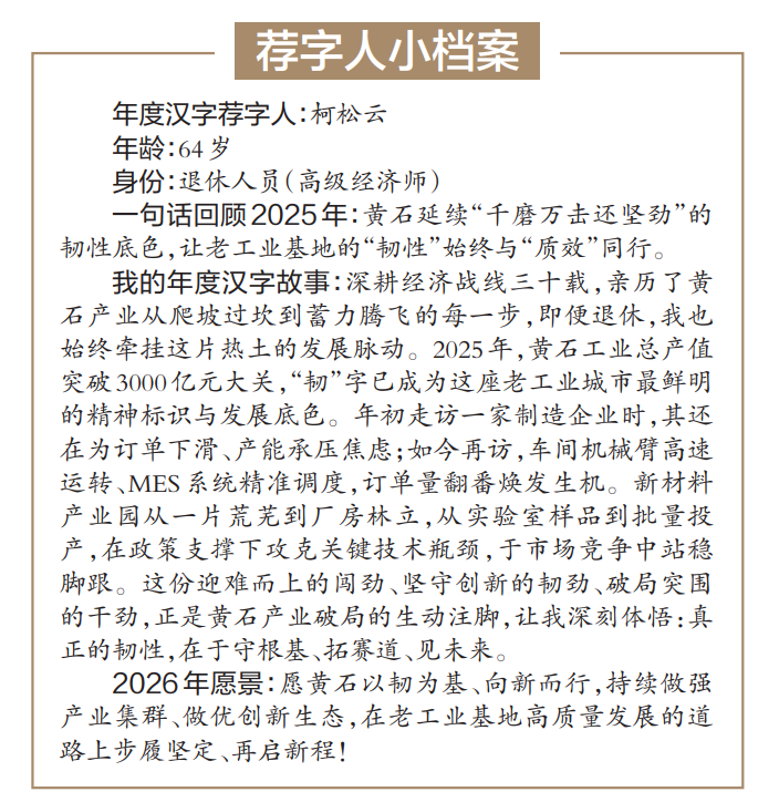 我的年度汉字故事:深耕经济战线三十载,亲历了黄石产业从爬坡过坎到蓄力腾飞的每一步,即便退休,也始终牵挂这片热土的发展脉动。2025年,黄石工业总产值突破3000亿元大关,“韧”字,已成为这座老工业城市最鲜明的精神标识与发展底色。年初走访一家制造企业时,其还在为订单下滑、产能承压而焦虑;如今再访,车间里机械臂高速运转、MES系统精准调度,订单量实现翻番,焕发生机。新材料产业园也从一片荒芜到厂房林立,从实验室样品到批量投产,在政策春风中攻克关键技术瓶颈,在市场竞争中站稳脚跟。这份迎难而上的闯劲、坚守创新的韧劲、破局突围的干劲,正是黄石产业破局的生动注脚。它让我深刻体悟:真正的韧性,在于守根基、拓赛道、见未来。