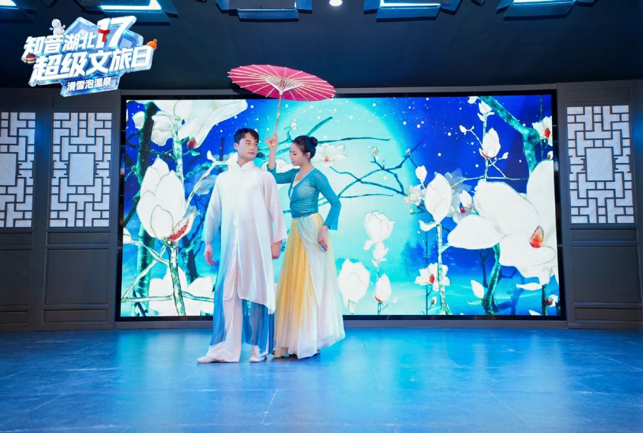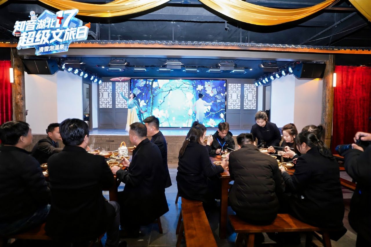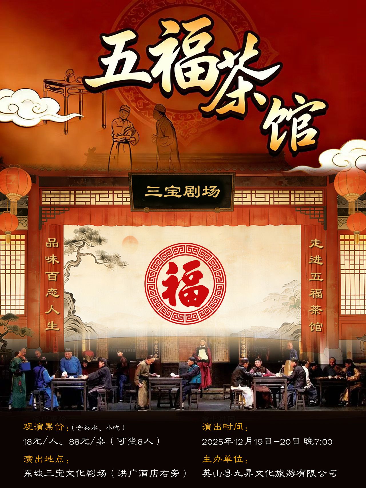 冬夜的英山县东坡三宝体验店(洪广店),五福茶馆内茶香袅袅、丝竹悠扬。每晚7时30分,随着台上唱念做打声起,台下百余名观众即刻沉浸在宋韵雅集与人间烟火交织的氛围中。