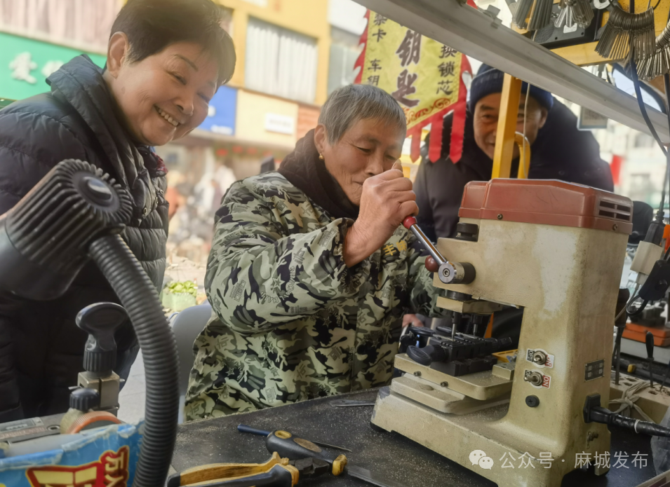 这份初心,也温暖着每一个来过摊位的人。有从外地返乡的游子,路过鼓楼洞看到丁师傅的摊位,忍不住停下脚步:“小时候跟着爸妈来配钥匙的场景还在眼前,如今回来,师傅还在这儿,乡愁感一下子就涌上来了。”有一次,一个外卖小哥来配钥匙,原本3元的工本费,小哥却硬是丢下20元钱就跑。还有一位外地来的年轻女子,配钥匙时笑着说,小时候就见过丁师傅在这儿摆摊,说完便执意多塞10元钱。丁周友连连摆手不要,女子却硬是把钱留在了摊位上。更让人动容的是,当年那个被帮了大忙的武汉车主,去年专程带着水果赶到麻城,就为了看看丁师傅夫妇是否安好。从懵懂少年到白发老者,从一把锉刀到几台机器,丁周友和刘东银夫妇守着的不只是一个摊位,更是一份扎根市井的匠心,一段温暖岁月的深情。