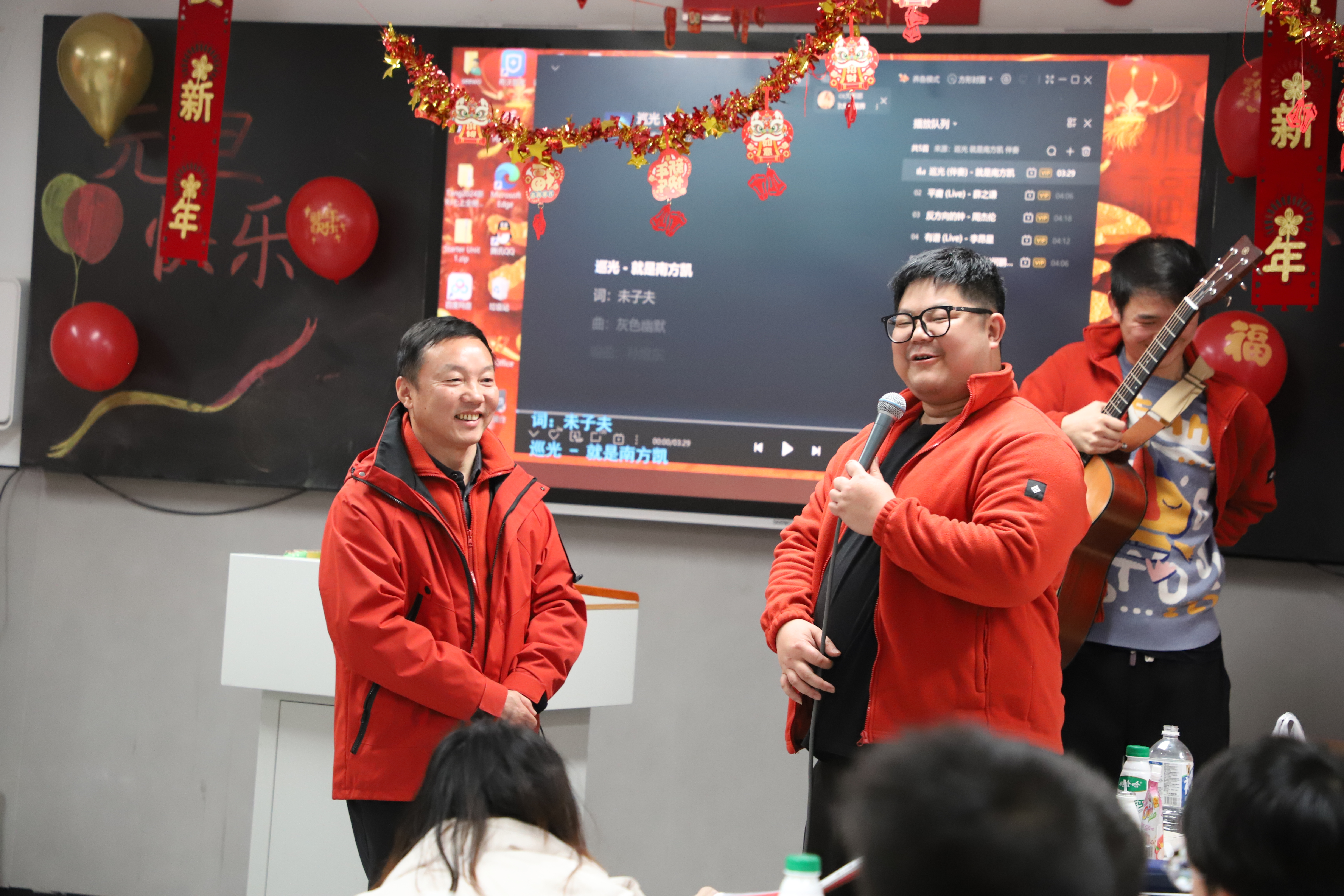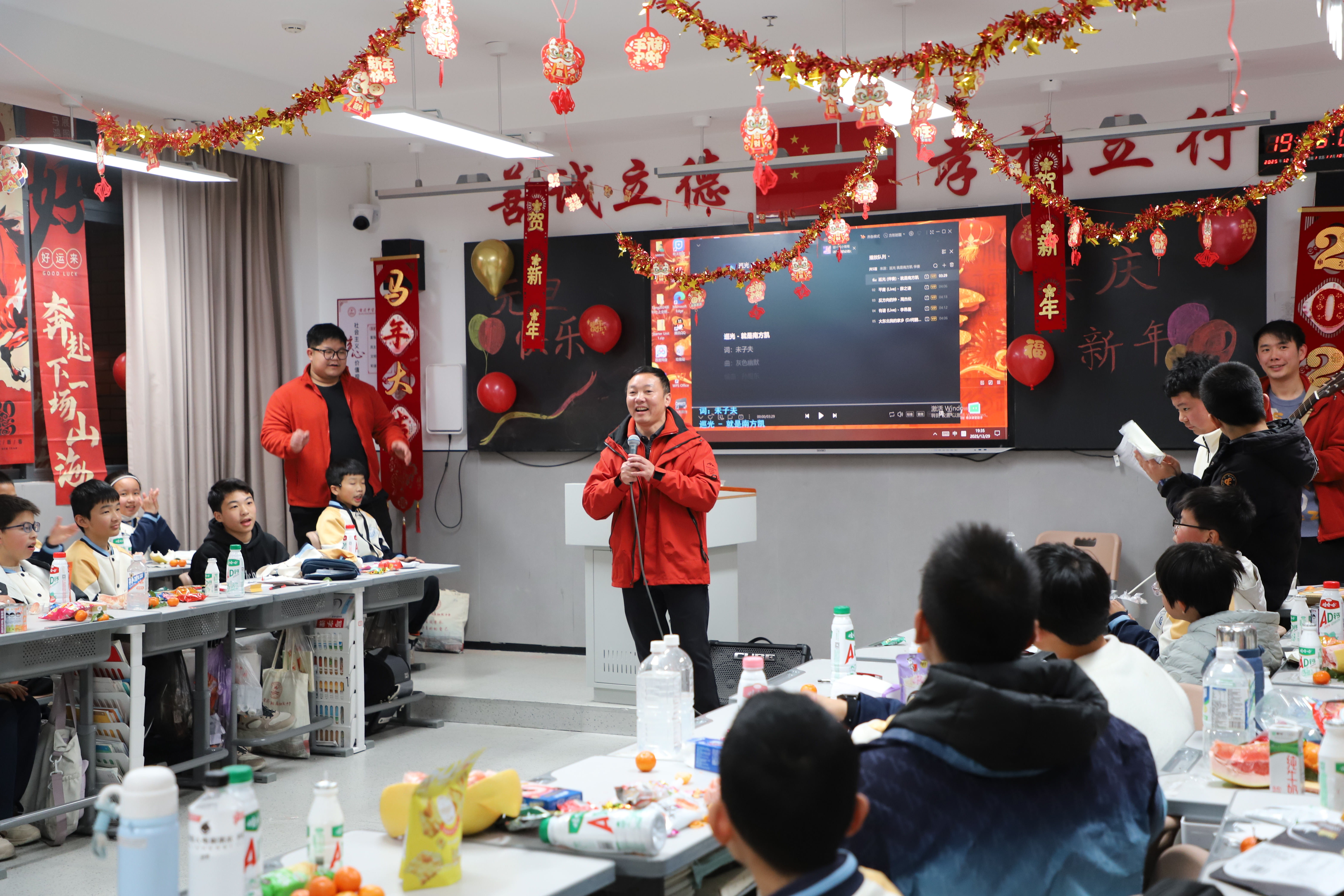 带着水饺的余香,学生们返回教室,开启班级“迎新年晚会”的欢乐时光,大家自编自导自演,精彩节目不断,将迎新年活动推向高潮,掌声、笑声洒满一个个教室。校长李小平携音乐老师,一个个班级进行看望。每进一间教室,李小平首先给师生们送去新年的祝福,随后勉励学生们珍惜时光、努力学习,争做附中有为学子。