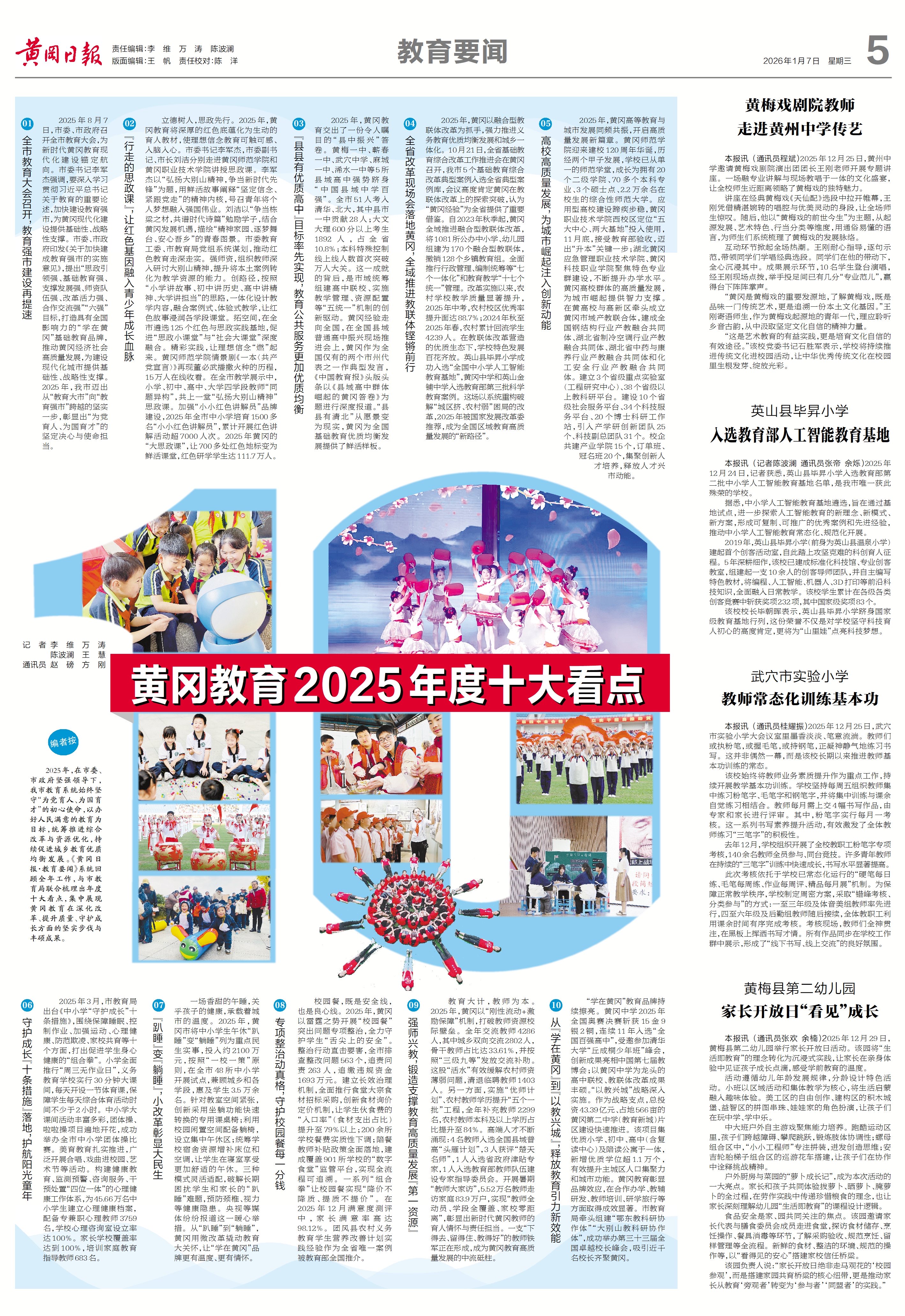 2025年,在市委、市政府坚强领导下,我市教育系统始终坚守“为党育人、为国育才”的初心使命,以办好人民满意的教育为目标,统筹推进综合改革与资源优化,持续促进城乡教育优质均衡发展。《黄冈日报·教育要闻》系统回顾全年工作,与市教育局联合梳理出年度十大看点,集中展现黄冈教育在深化改革、提升质量、守护成长方面的坚实步伐与丰硕成果。