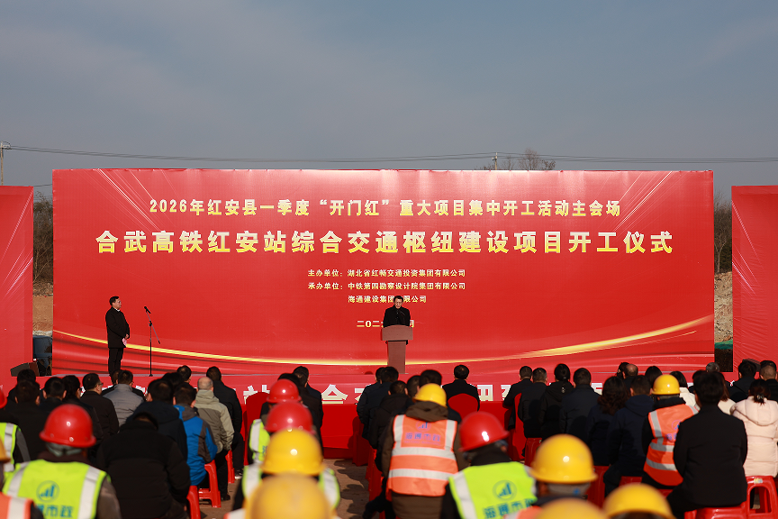 湖北日报客户端讯(通讯员石杰、张胜红、沈捷、刘伊凡、王欣)春潮涌动千帆竞,项目攻坚正当时。1月9日上午,红安县2026年一季度“开门红”重大项目开工活动在合武高铁红安站综合交通枢纽建设项目现场举行。红安县委书记胡广,县委副书记、代县长钟林,以及张凤珍、余宏波、余品祥等县领导,相关单位、乡镇负责人,参建单位代表参加活动。