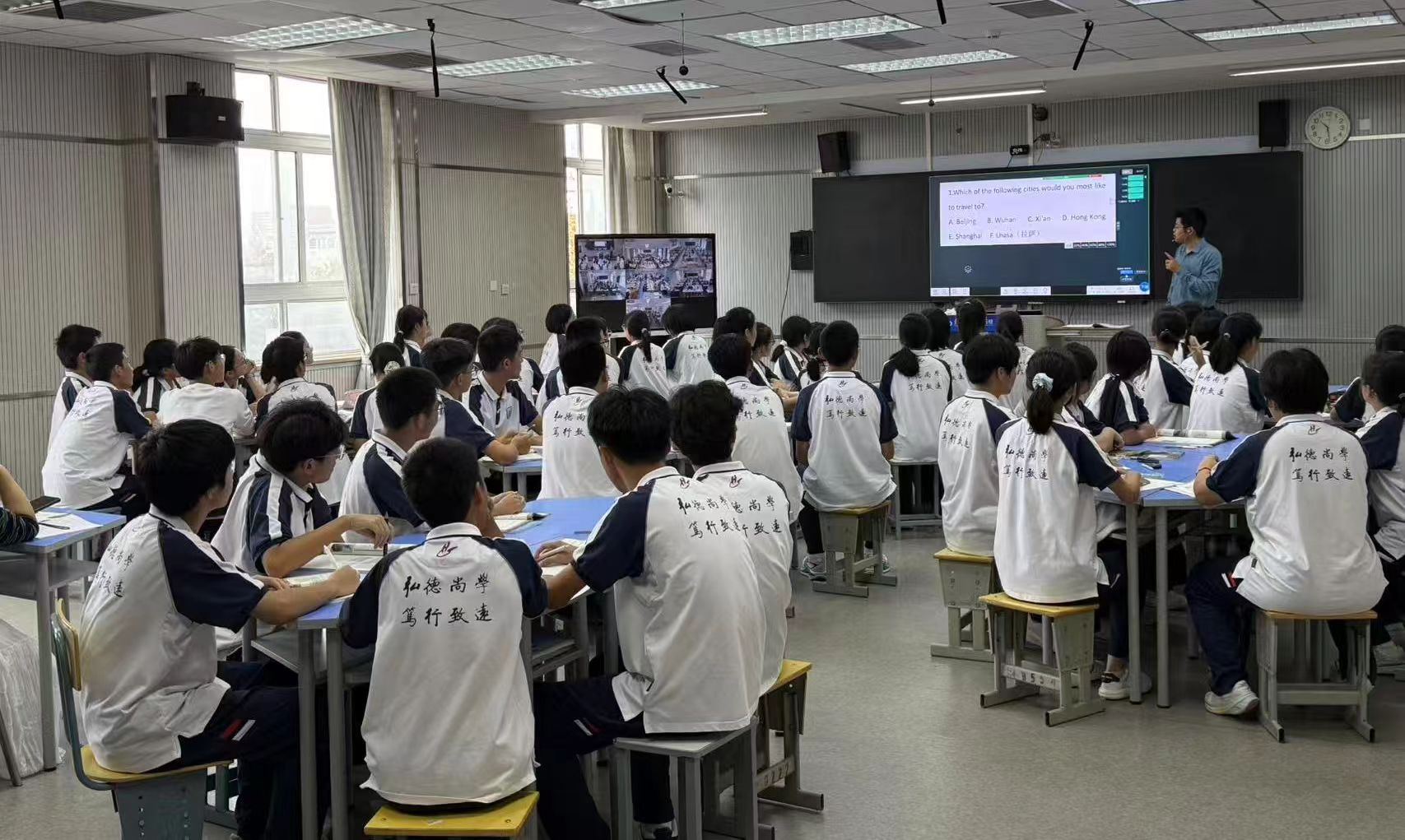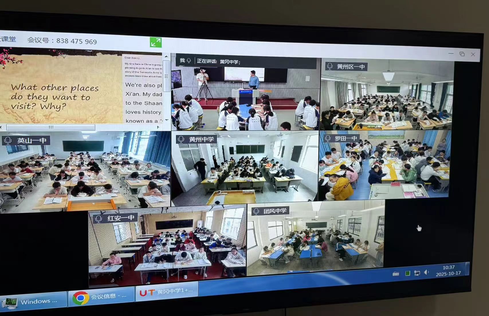 2025年10月21日,在黄冈中学云课堂教室,高一(19)班英语教师朱冉冉带来一堂“双师课堂”,通过高清直播技术,与黄冈中学联校的6所成员校学生实现异地同堂、实时互动。师生问答、小组讨论等环节顺畅自然,赢得了参观团的高度认可。