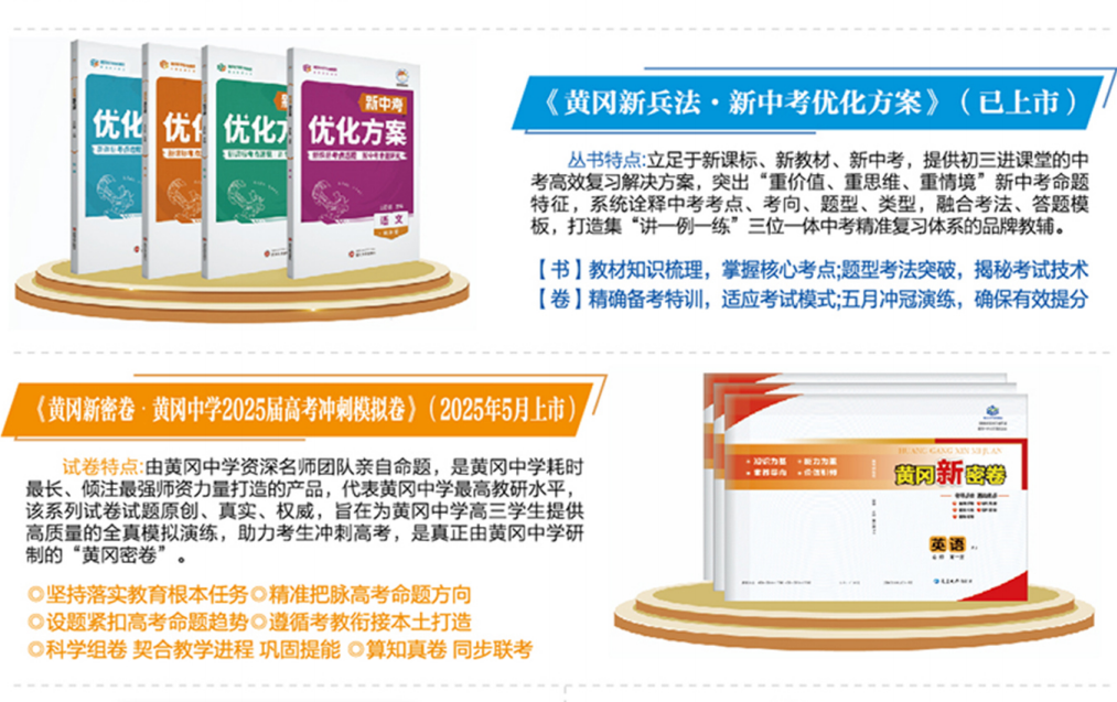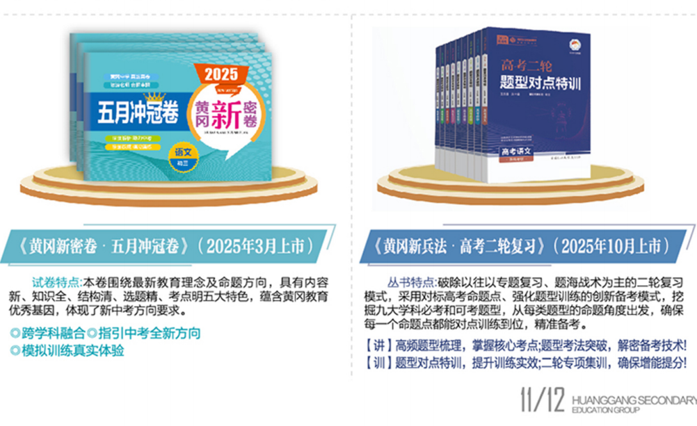 2025年,自主研发的《黄冈新密卷·黄冈中学金卷》《黄冈新密卷·五月冲冠卷》《黄冈新兵法·黄冈作业本》《黄冈新兵法·新中考优化方案》《黄冈新兵法·高考二轮复习》《黄冈新兵法·寒暑假作业》等6大系列产品已成功上市,一条“研发在黄冈、出版在武汉、销售在全国”的教辅产业链已初具雏形。