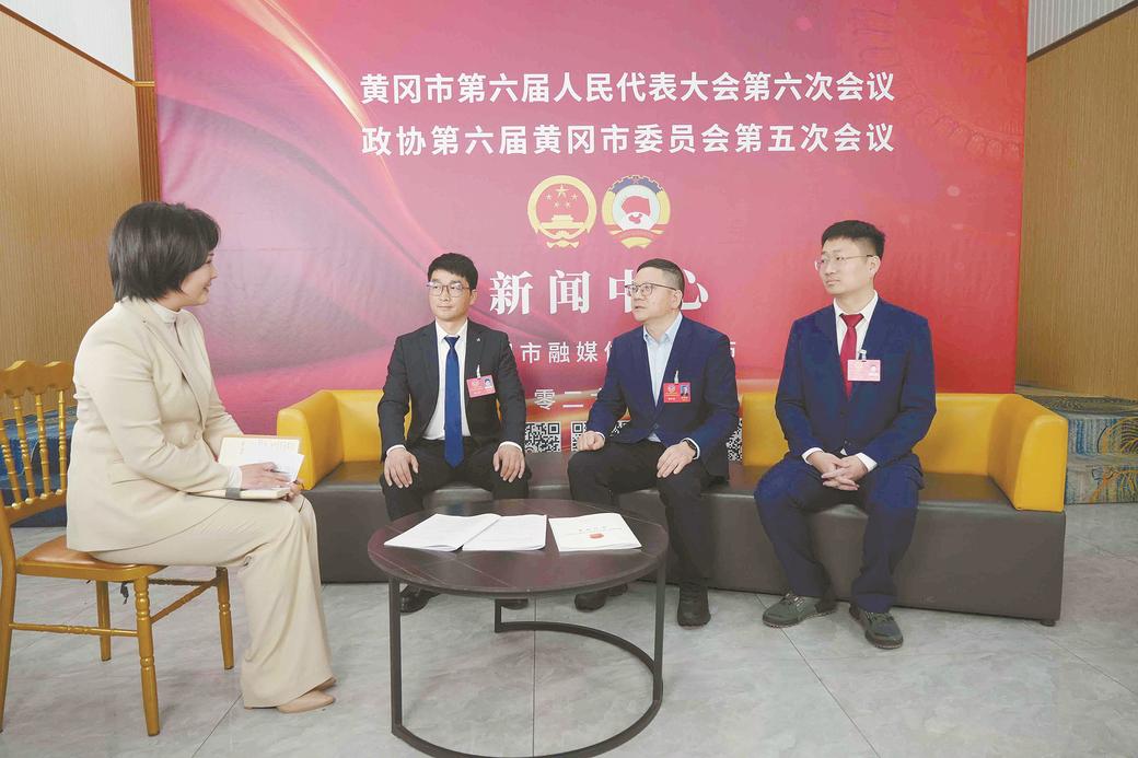 1月13日,市政协委员,湖北小野生物科技有限公司总经理陈小野(右一),市政协委员,楚环科技股份有限公司董事长陈步东(右二),市人大代表,湖北省宏源药业科技股份有限公司副董事长尹聃(右三)接受市融媒体中心主持人(左一)采访。记者 陈子恒 摄