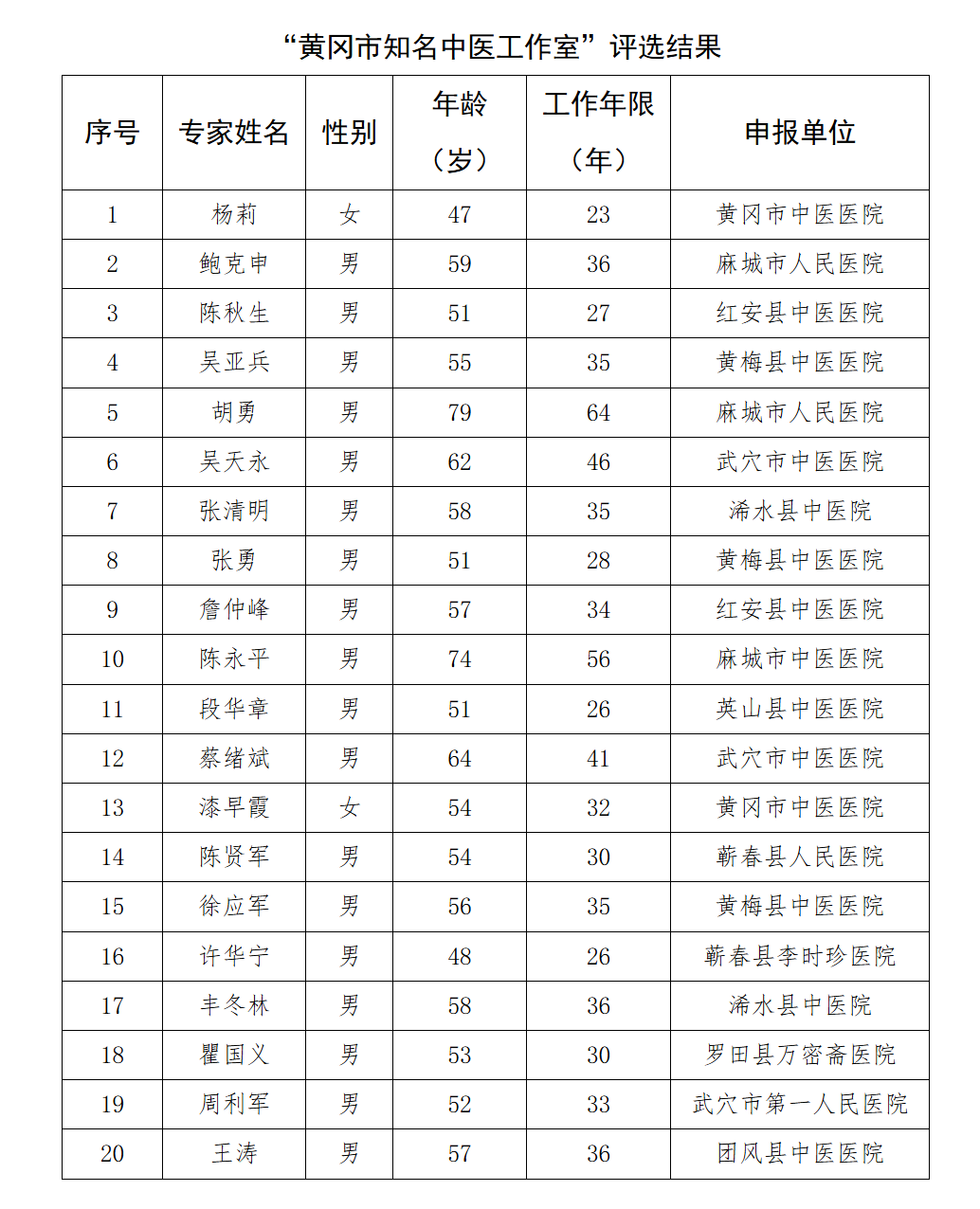 黄冈市知名中医工作室评选结果公布