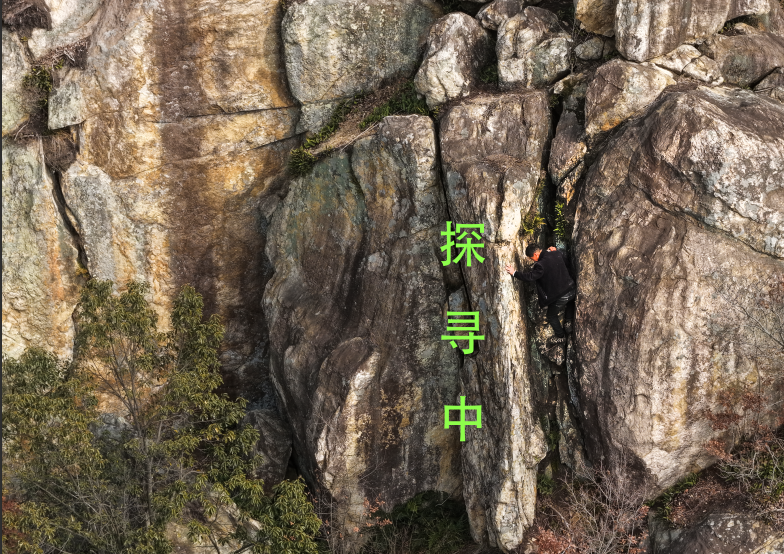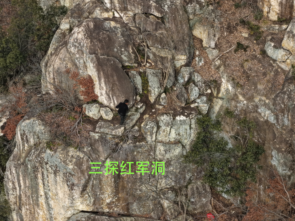 七八年前的攀爬路线在落叶掩映下依旧清晰,此行比初次探访顺遂许多。“找到了,找到了!”玄妙观邹观主的欢呼声打破山间静谧,“今日罗田”主播小郭立刻向后传递喜讯。万丈陡石岩上,一条巨石对峙的窄巷延伸十米,越往前越显逼仄,尽头便是仅容一人侧身通过的“过山洞”,因未知深浅,我们未敢贸然深入。而此行寻觅的红军洞,恰在岩边下方。我叮嘱众人谨慎前行,此前叶志义老人曾深情追忆:土地革命时期,英罗边区红军游击队常在这一带活动,重伤员便由玄妙观道人与观音山和尚引路,藏身于此洞养伤。彼时,山下油茶林便是游击队的“补给站”,道人与和尚常采摘茶果榨油,偷偷送上山来,为伤员滋补身体。洞内高大幽深,老鼠重达三四斤、眼放绿光,蝙蝠体型堪比斑鸠,正是这常人忌惮的环境,成了红军战士的天然庇护所——这亦是我前两次探访的亲眼所见。几番摸索探寻,红军洞终露真容,我们即刻舞动红绸带,向无人机跟随拍摄(安全监控)的李茂同志发出找到目标的信号。