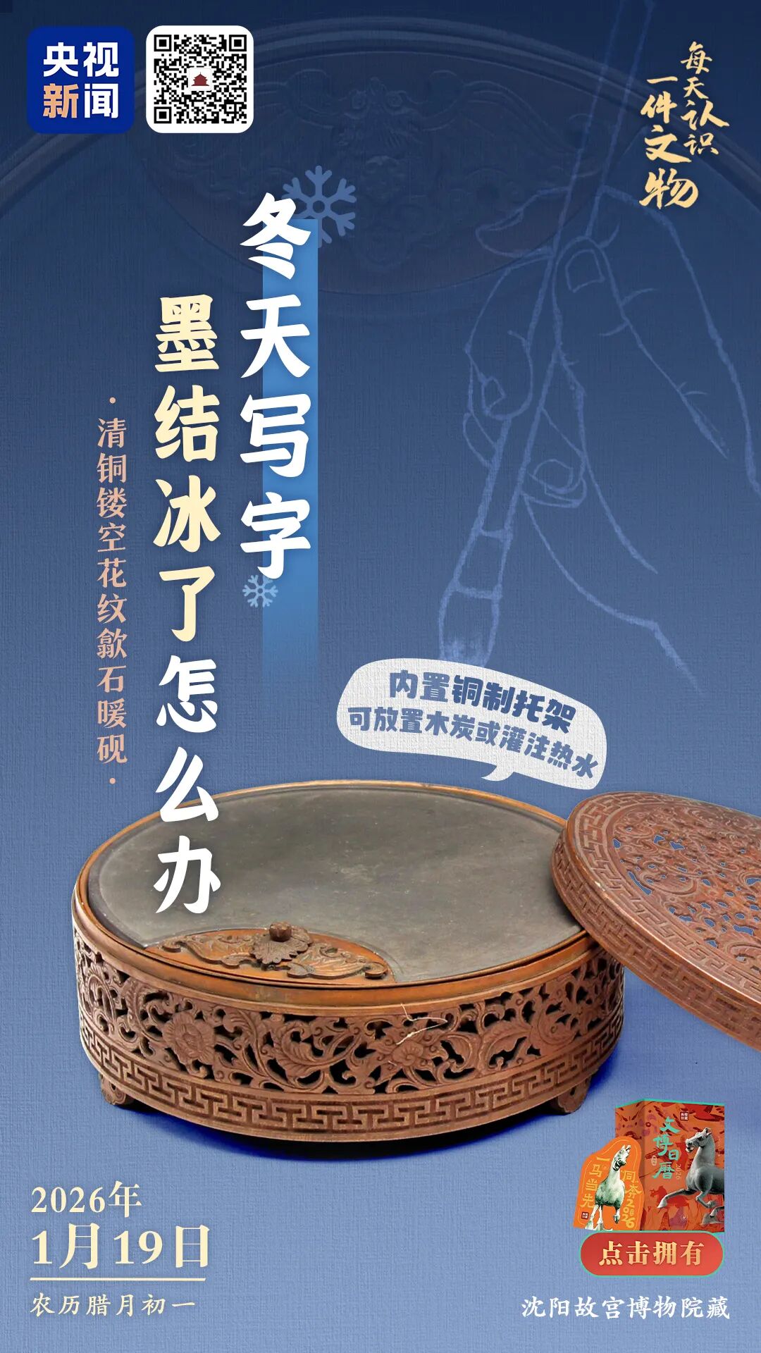 寒冬腊月,研墨写字,墨汁很快凝结成冰,怎么办?别担心,古人自有妙招!清铜镂空花纹歙石暖砚是一件清宫御用文房用具,砚下为铜制托架,可放置木炭或灌注热水,可以说是陪伴书桌的温暖“搭子”。
