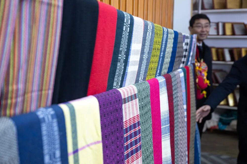 这些年,陶文成的大布生意越来越红火,产品涵盖服饰、床品、文创产品、装裱字画等20多个品类。为凸显当地红色文化底蕴,他还耗时十天,将家喻户晓的革命歌谣织进手工作品。