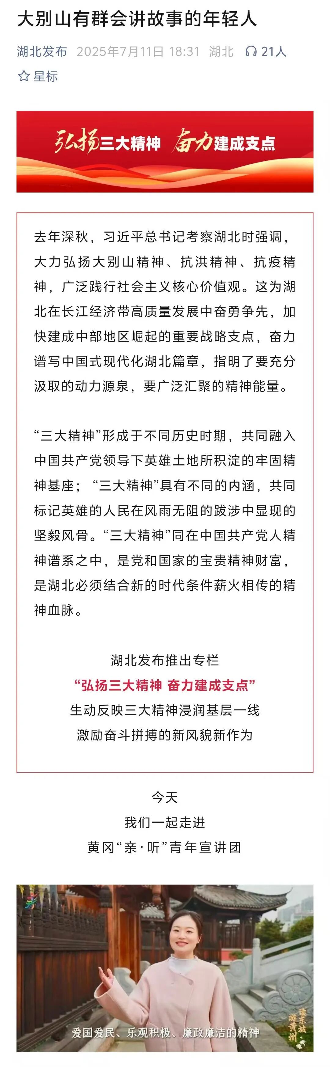 2025年7月11日,湖北发布推出《大别山有群会讲故事的年轻人》一文,认为这是生动反映三大精神浸润基层一线,激励奋斗拼搏的新风貌新作为。