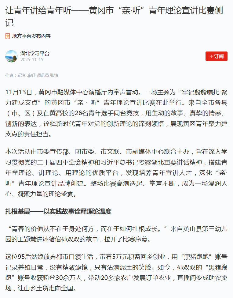 2025年11月25日,学习强国报道了黄冈市“亲・听”青年理论宣讲比赛,称其为一场浸润人心、凝聚力量的理论盛宴。