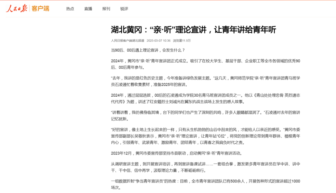 2025年3月7日,人民日报客户端在《湖北黄冈:“亲·听”理论宣讲,让青年讲给青年听》一文中,称赞黄冈“亲·听”青年宣讲的“时代味”“青年味”“理论味”愈发浓郁。