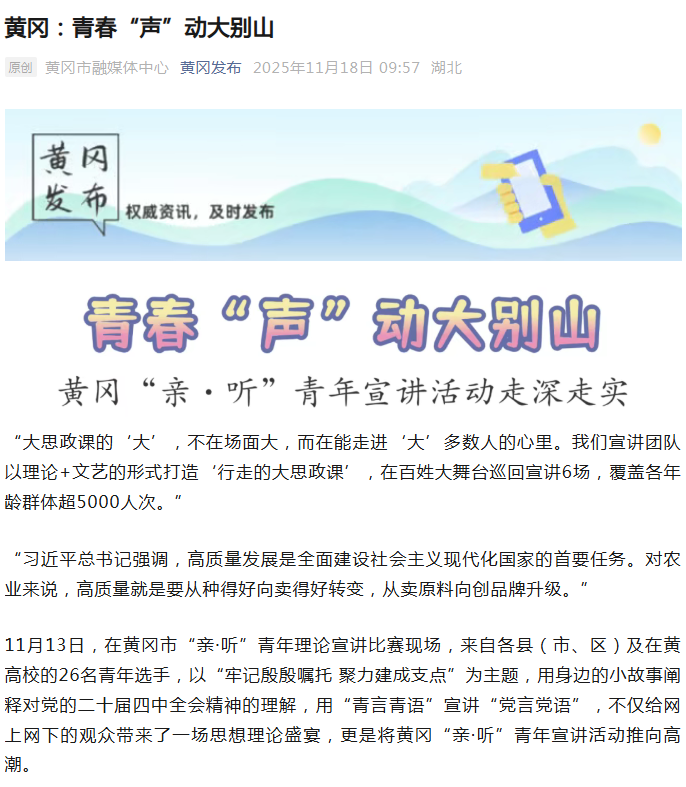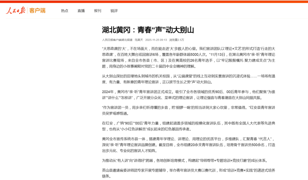 2025年11月25日,人民日报客户端在《湖北黄冈:青春“声”动大别山》一文中,写道黄冈市“亲·听”青年宣讲团让理论强音与青春潮音在大别山同频共振。