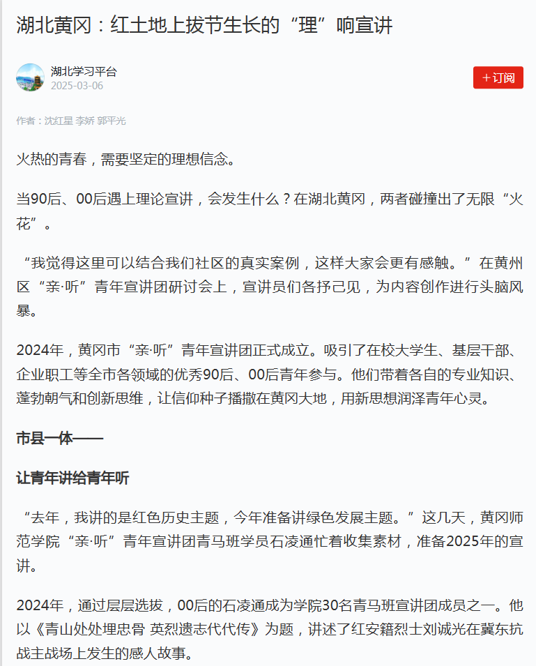 2025年3月6日,学习强国在《湖北黄冈:红土地上拔节生长的“理”响宣讲》一文中称,黄冈市“亲·听”青年宣讲团让信仰种子播撒在黄冈大地,用新思想润泽青年心灵。