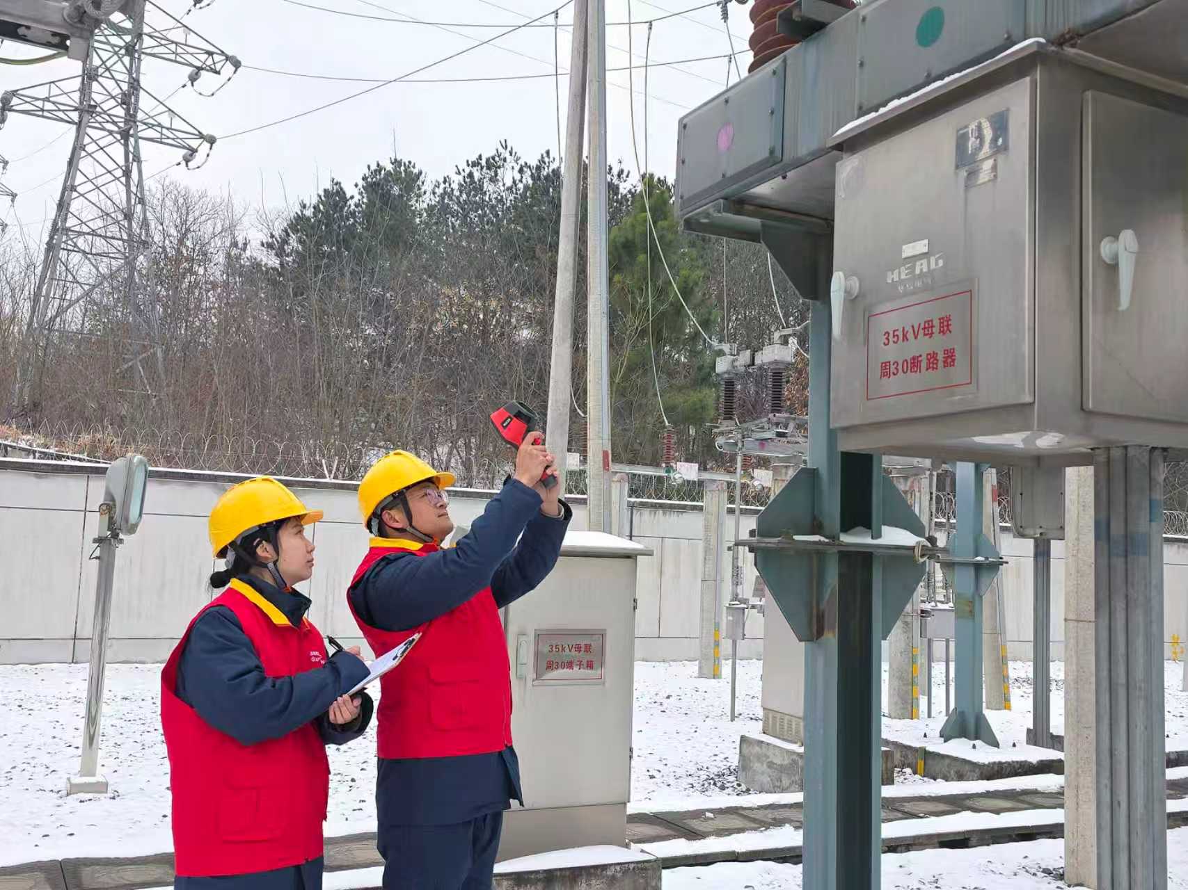 寒风凛冽,卷着细密的冰晶扑面而来。两人全副武装,立即投入工作。在主控室和高压室,他们细致检查确认各保护装置运行正常、后台数据稳定可靠。紧接着,他们手持红外测温仪,毅然踏入室外刺骨的寒风中。两人默契配合,对主变、断路器、母线连接点等关键设备进行全覆盖测温。余洋全神贯注,紧盯测温仪屏幕上跳跃的数值和热成像图谱,捕捉异常发热点,熊熠霖同步记录数据并与历史信息动态比对,确保排查无死角。