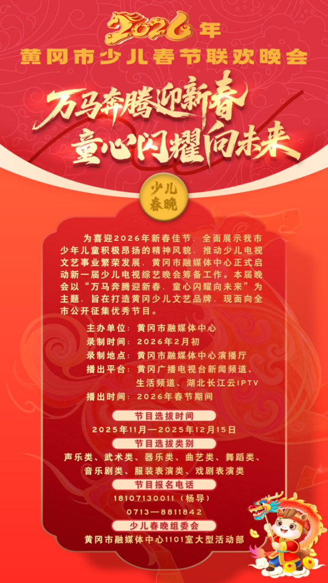 在 2026 年马年新春即将到来之际,由黄冈市融媒体中心倾力打造的 “万马奔腾迎新春,童心闪耀向未来”2026年黄冈市少儿春节联欢晚会,将成为黄冈全市少年儿童展示自我、逐梦绽放的盛大舞台。作为黄冈本土最具影响力的少儿文艺品牌活动之一,本届晚会延续了往届高水准、高口碑的制作传统,以 “童心” 为内核,以 “未来” 为方向,通过丰富多彩的艺术形式,全方位展现黄冈少年儿童积极向上、朝气蓬勃的精神风貌,为全市观众送上一份充满童真与活力的新春祝福。