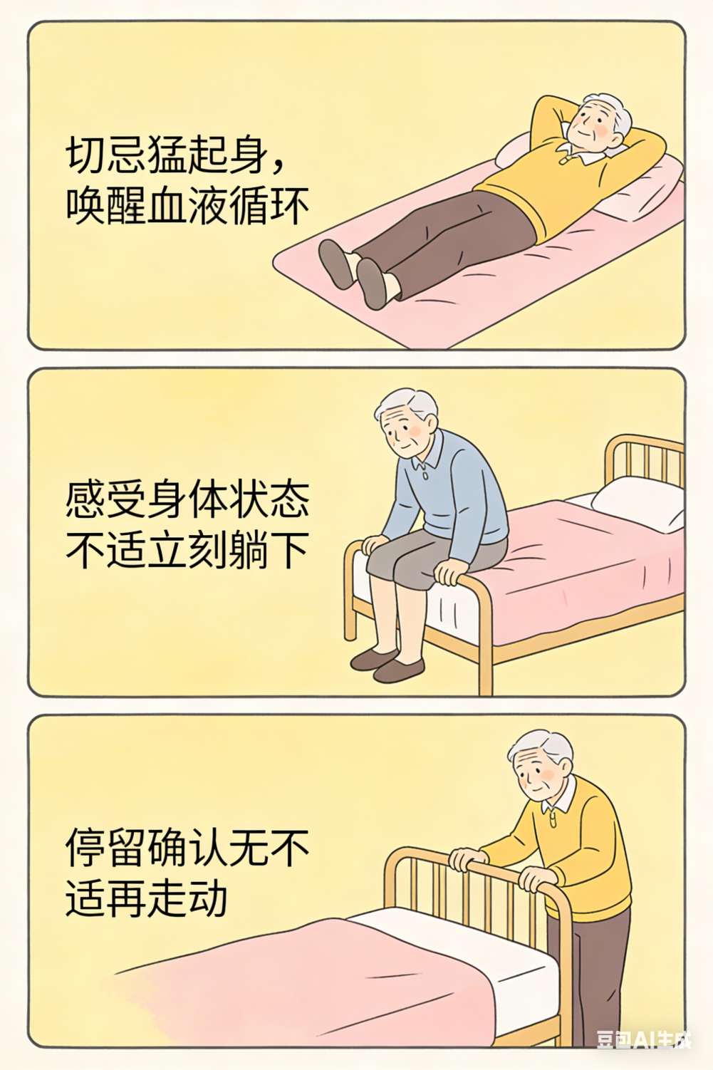 3. 醒后第3分钟:扶着床头或墙壁,缓慢站立,停留30秒-1分钟,确认无不适后,再慢慢走动,避免快速移步导致摔倒或血压波动。