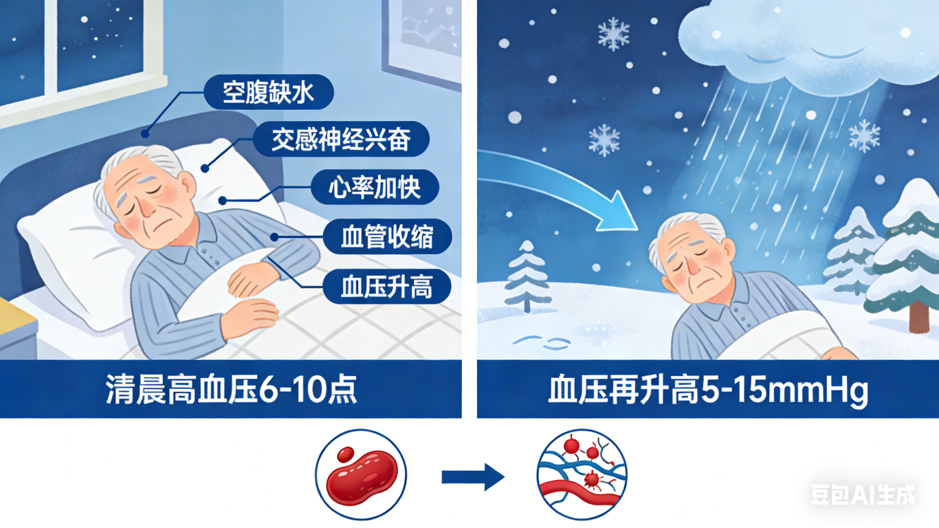人体经过一夜的睡眠,身体处于空腹、缺水状态,交感神经从抑制转为兴奋,心率加快、血管收缩,血压会自然升高,这就是医学上的“清晨高血压”,通常出现在6-10点。而冬季晨间气温极低,冷空气刺激会进一步加剧血管收缩,导致血压比其他时段再升高5-15mmHg,相当于给本就紧绷的血管“雪上加霜”。尤其是慢病老人,血管弹性差、调节能力弱,这种双重刺激下,血栓形成、血管破裂的风险会急剧上升,成为冬季慢病急性发作的高发时段。
