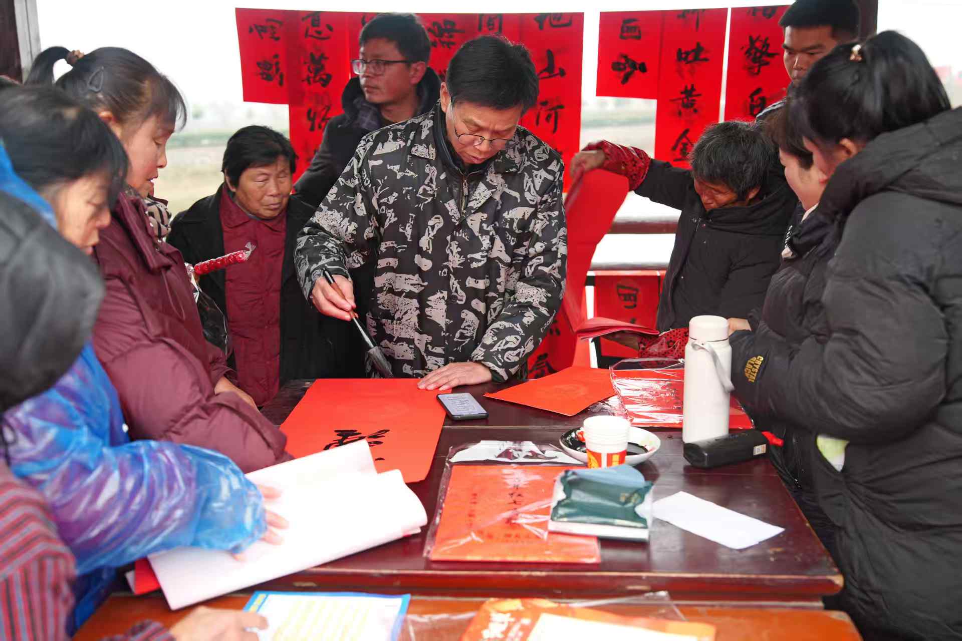 黄州书画诗联协会的书法家挥毫泼墨,一副副满载祝福的春联免费送到村民手中;非遗糖画艺人手腕轻转,晶莹剔透的糖丝在石板上勾勒出龙凤呈祥的图案,引得孩童们围追惊叹;风味腊货、手工豆糕等特色摊位前香气扑鼻,打糍粑的木槌声此起彼伏,村民们亲手捶打软糯的糯米,将团圆的甜蜜揉进每一粒米香中。