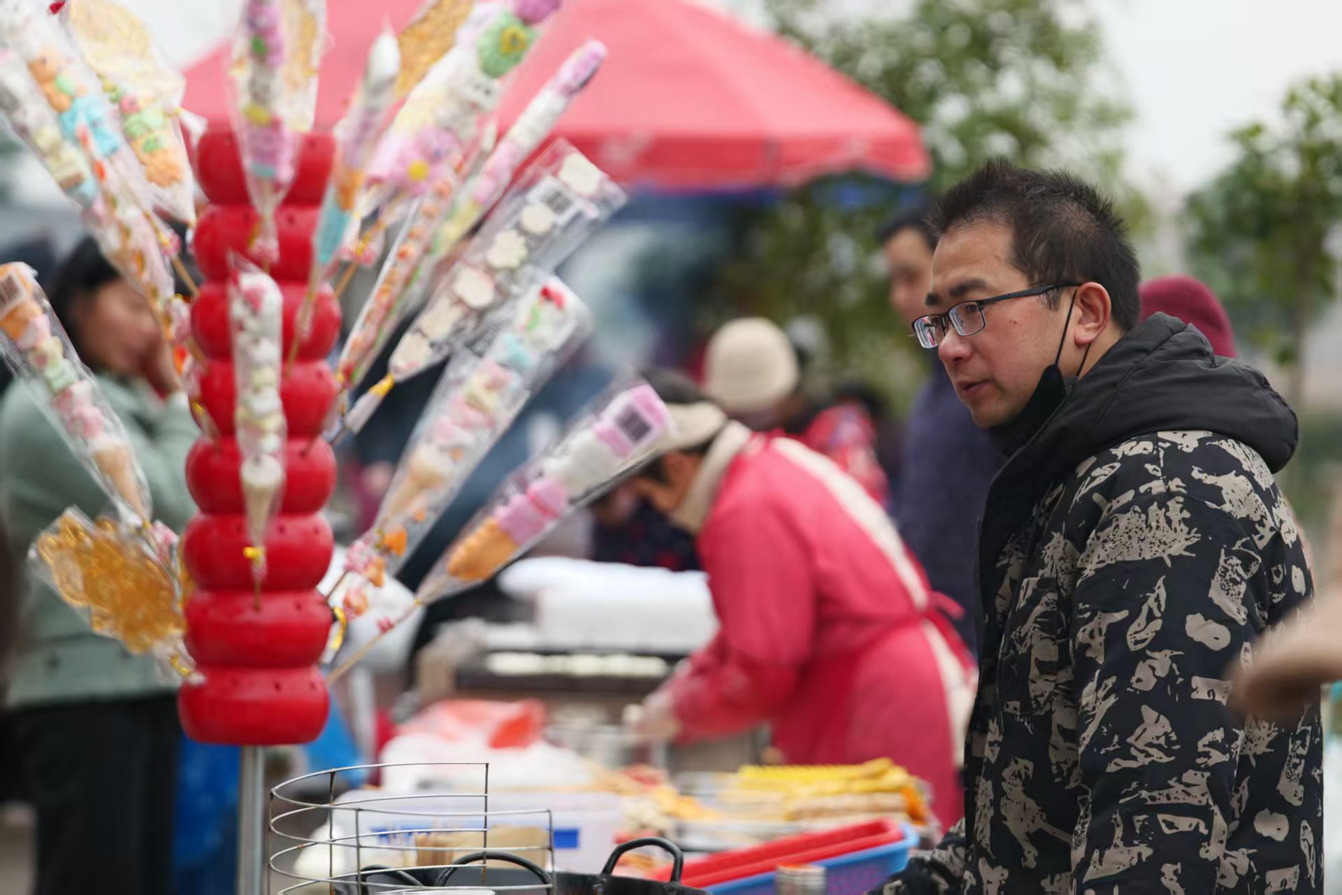 非遗剪纸摊位前,红纸在巧手中翻飞成喜鹊登梅、年年有余的吉祥纹样,让传统技艺在指尖代代相传,唤醒乡土记忆与文化认同。
