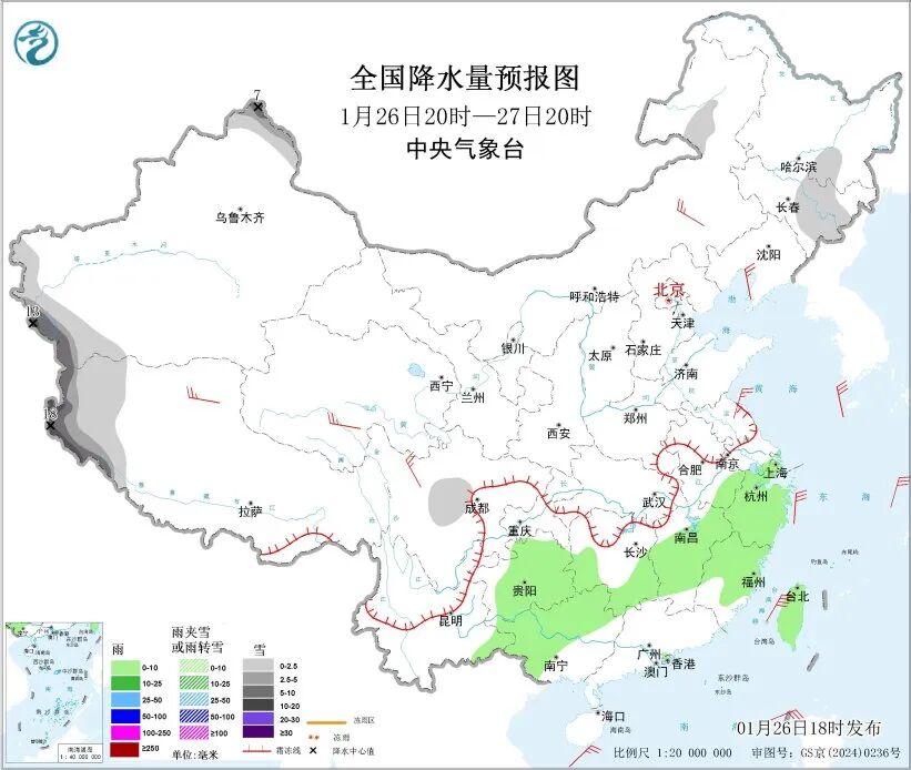 中央气象台预计,26日20时至27日20时,内蒙古东北部、黑龙江东南部、吉林东部、新疆北疆北部和南疆盆地西部、西藏西部、川西高原北部等地部分地区有小到中雪,其中,新疆北疆北部、西藏西部等地部分地区有大雪,局地暴雪。江南东部和南部、贵州大部、广西大部、台湾岛等地部分地区有小雨。
