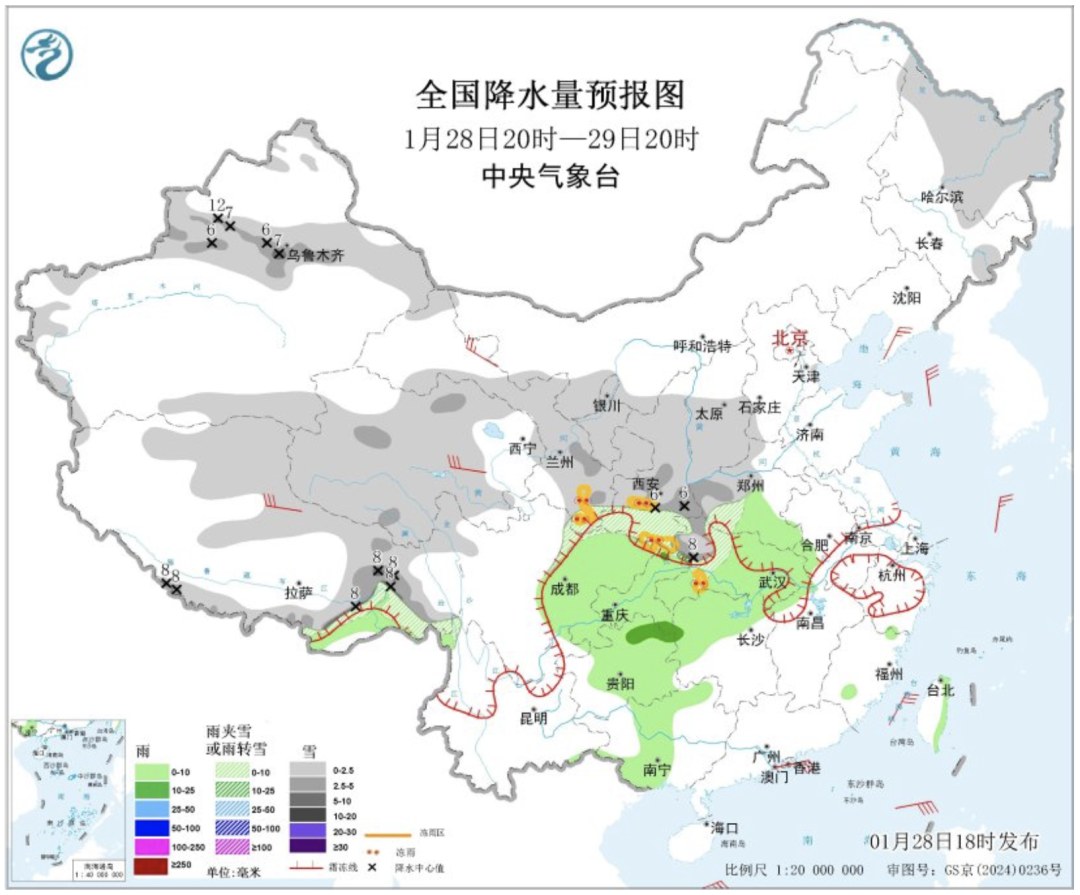 中央气象台预计,受冷暖空气共同影响,29日至31日,中东部地区有较大范围雨雪天气过程。陕西东南部、河南西部、湖北西北部、苏皖南部、湖南中部、贵州东部等地部分地区有大雪、局地暴雪,高海拔山区局地有冻雨。