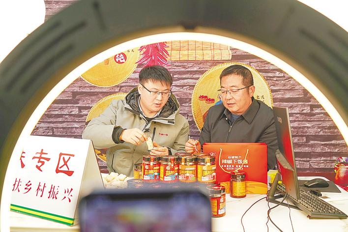 “家人们,这场年货节不玩虚的,主打就是咱村‘熊岗红’地道辣椒酱!”2月7日,全国农村电商“领跑县”谷城的乡村直播间里年味正浓,该县五山镇熊家岗村正举办网上年货节,村党支部书记安坤手持两瓶红亮诱人的辣椒酱,热情为家乡特产代言。