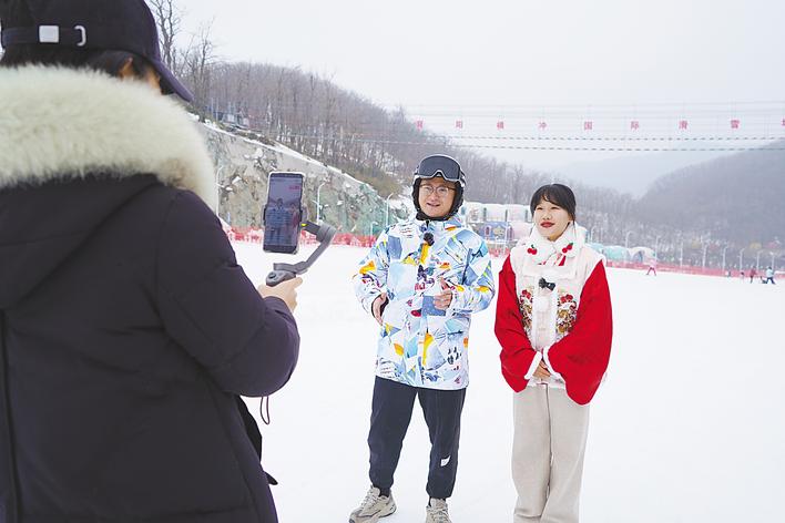 “家人们,我们有三条雪道,新手老手、大人小孩都能玩得开心。过年想来点新鲜体验的,千万别错过咱们的专属套餐!”山风凛冽,主播代佳宜身着喜庆的汉服,面向镜头,热情洋溢。