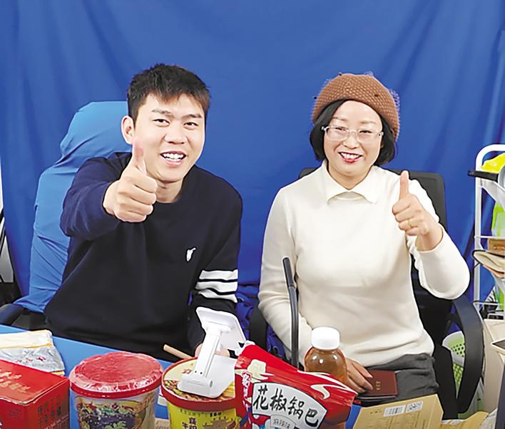 湖北日报全媒记者(右)和网红“襄阳白菜”一起直播打年货。(湖北日报实习生 高子涵 摄)