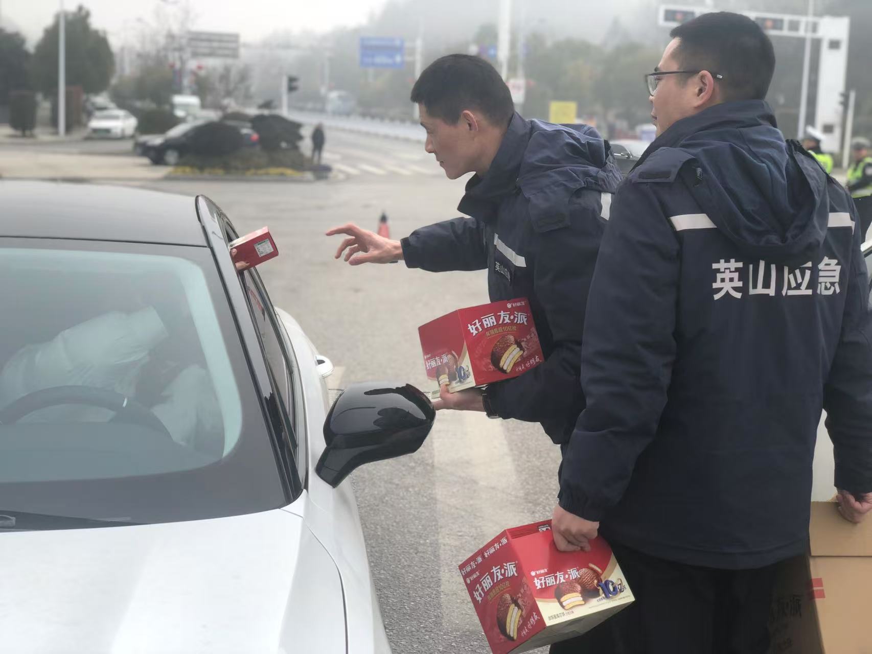 本报讯(通讯员 谭文 刘超)“司机朋友们,因大雾天气,前方高速临时封闭,请大家少安毋躁。饿了渴了,我们这里准备了面包、饼干和牛奶。”这是2月11日上午9时,英山县应急管理局工作人员在武英高速英山入口处,为等待通行的司机送上的温情提示。