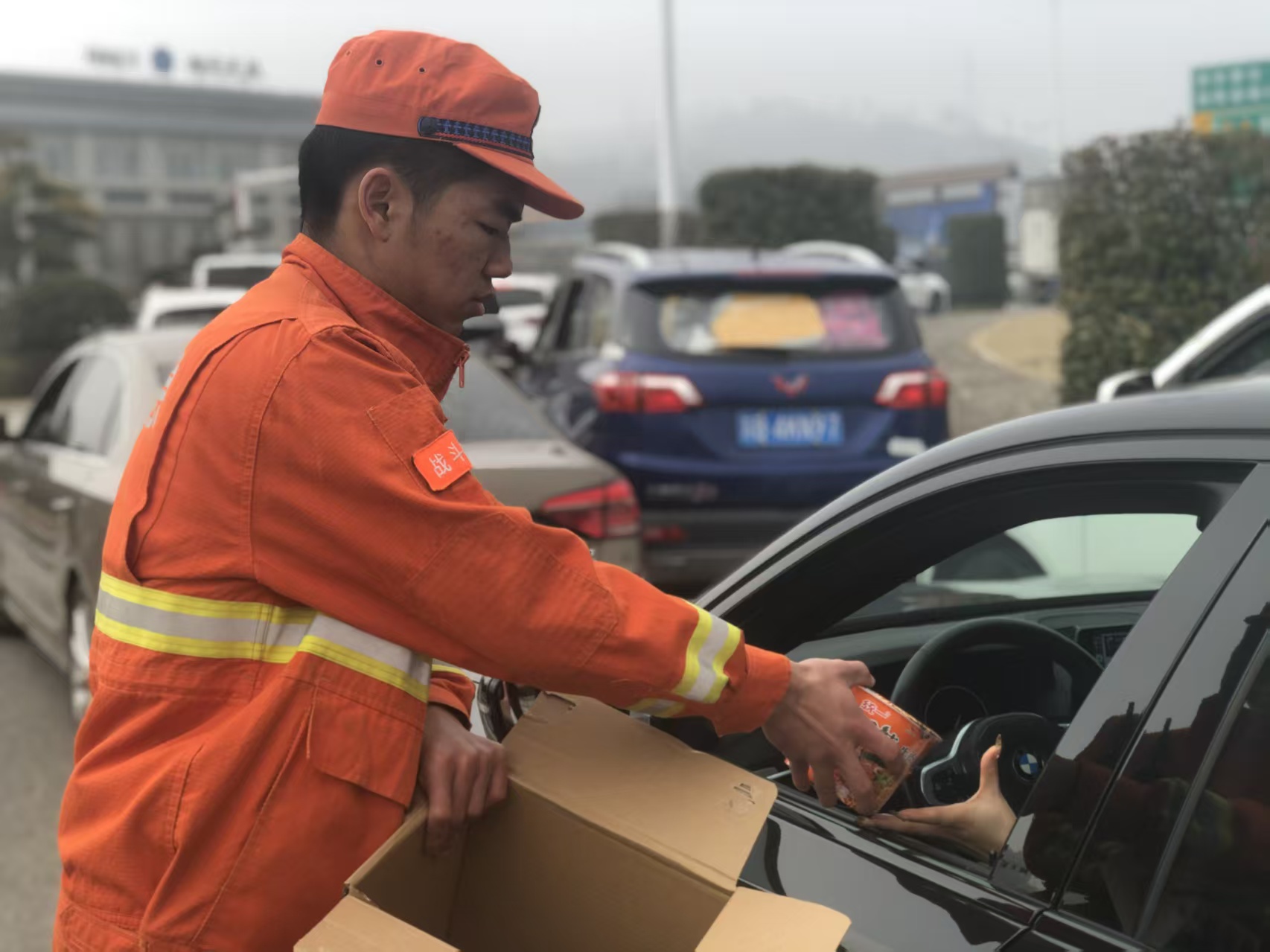 应急队员顶着浓雾、坚守一线,在现场有序引导车辆、安抚滞留人员情绪,同步向过往司乘免费发放方便面、面包、热水等应急物资,把温暖送到群众身边。同时,用接地气的“大白话”开展安全宣传,提醒大家雾天出行牢记降速、控距、亮尾,服从现场指挥,耐心等待通行,不抢行、不占道,牢牢守住出行安全底线。