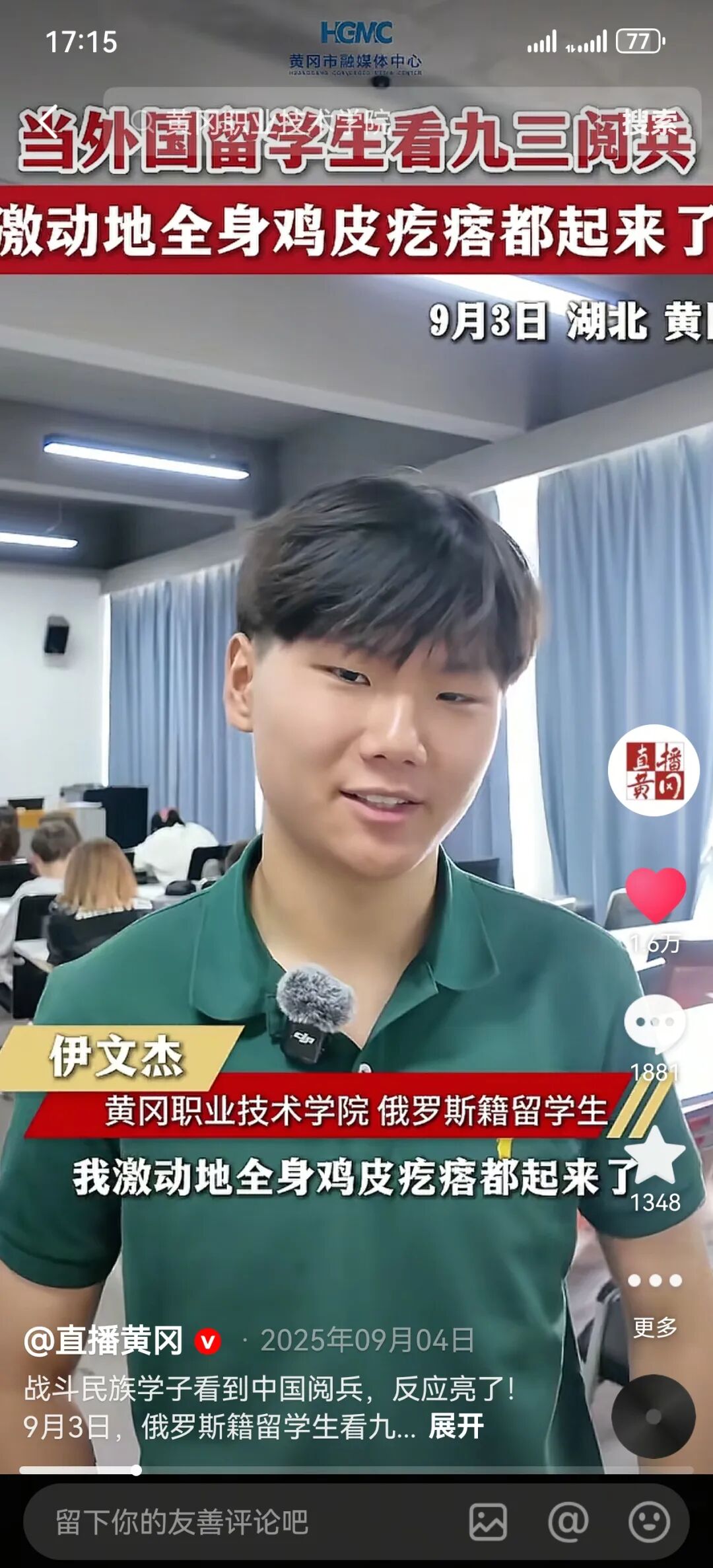 ▲黄冈的俄罗斯籍留学生看九三阅兵,激动地全身鸡皮疙瘩都起来了!
