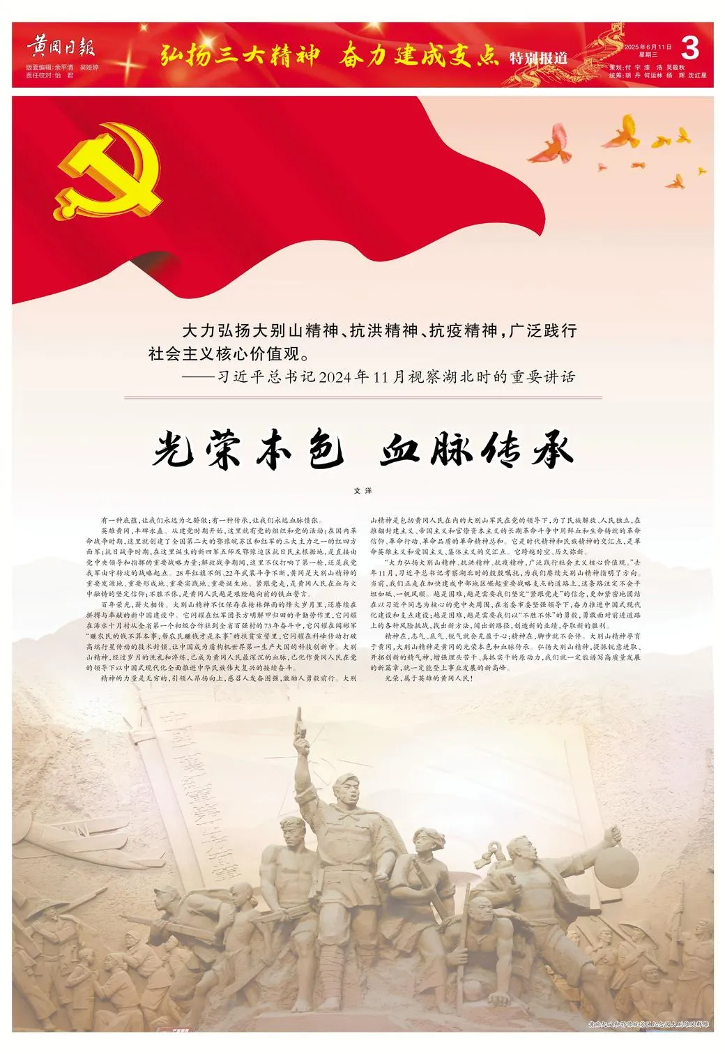 习近平总书记考察湖北时强调,大力弘扬大别山精神、抗洪精神、抗疫精神,广泛践行社会主义核心价值观。2025年6月,黄冈市委主要负责人主持召开座谈会,研究弘扬大别山精神工作。黄冈市融媒体中心推出“弘扬三大精神 奋力建成支点”系列特别报道,与湖北日报联手开展弘扬大别山精神“大别长红·英雄故里寻访记”全媒体报道,进一步激发了黄冈儿女的红色记忆。作为大别山精神的重要发源地,黄冈在革命战争年代用鲜血和生命铸就了不朽功勋,在加快建成支点的新征程中建功立业,贡献更大力量。