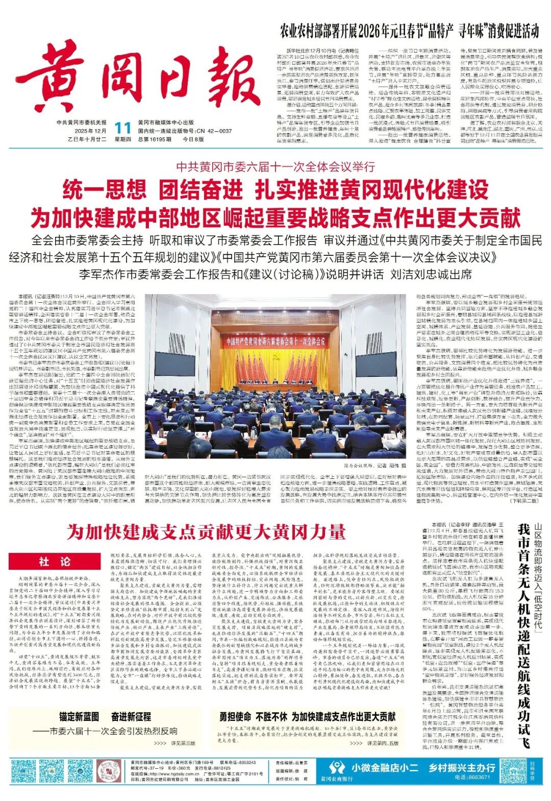 2025年12月10日,中国共产党黄冈市第六届委员会第十一次全体会议在黄州举行。全会审议通过《中共黄冈市委关于制定全市国民经济和社会发展第十五个五年规划的建议》,系统梳理“十四五”时期黄冈市发展取得的显著成就,对“十五五”时期黄冈经济社会发展作出顶层设计,明确了7个方面主要目标、13个方面54条规划要求。强调以城乡融合发展和乡村全面振兴统领经济社会发展,坚定不移实施“依托都市圈,辐射大别山”发展战略,在对内整合和对外开放中将比较优势转化为发展新动能,加快建设武汉都市圈协同发展重要功能区、全国革命老区高质量发展先行区,为湖北加快建成支点取得决定性进展贡献更大黄冈力量。
