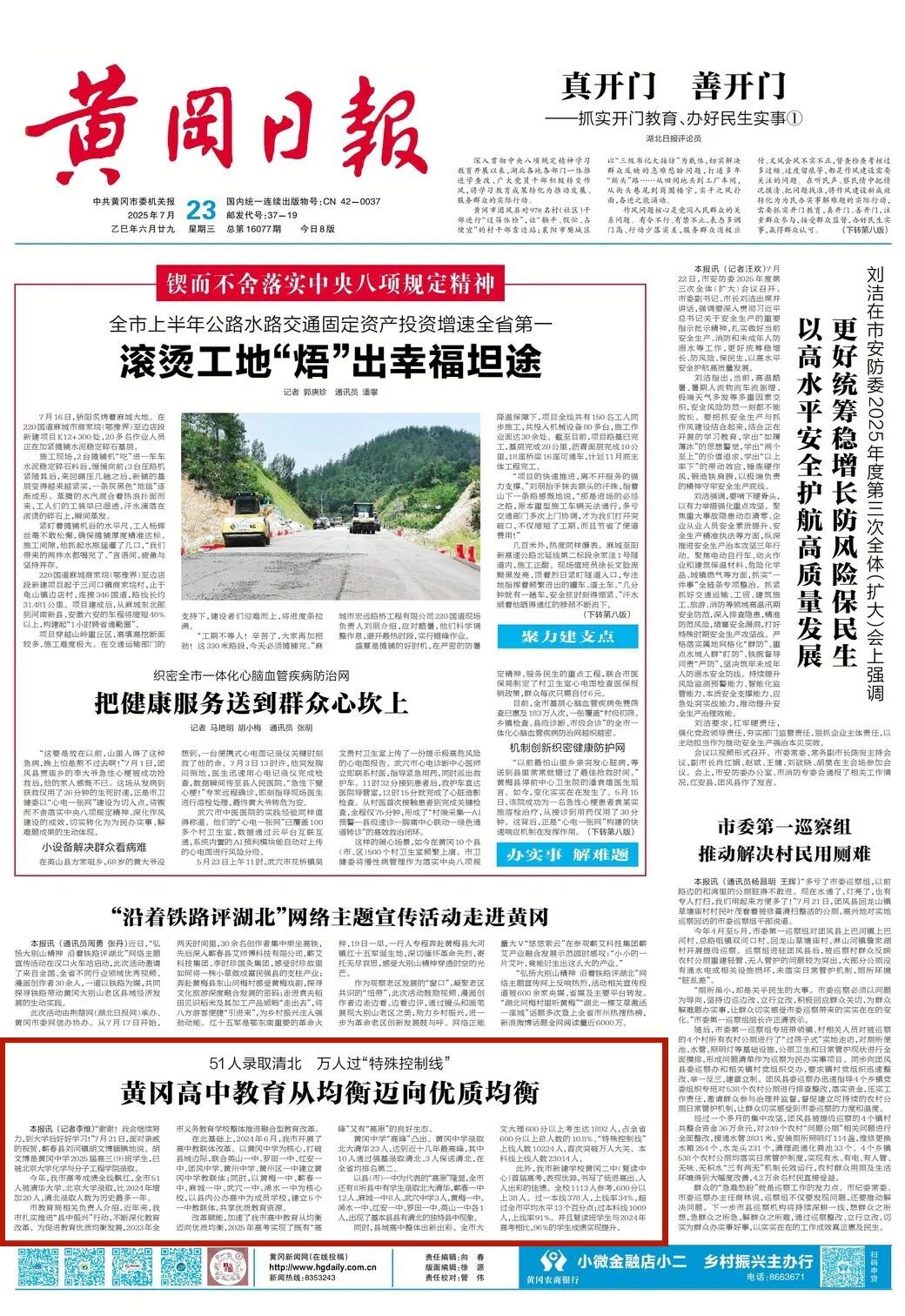 黄冈市2025年高考600分以上1892人,一本上线人数首次突破万人,本科上线23014人,黄冈51人被清华、北大录取,比2024年增加20人,创历史最多。这是我市深入推进融合型教联体改革的结果。组建170个教联体,实行编制、经费、管理等“七个一体化”,推进“县中振兴”行动,以黄冈中学为核心,打破县域边际,建立教联体,共享优质资源,95%的农村学生实现家门口上好学。蕲春一中、黄梅一中、麻城一中、武穴中学、浠水一中5所高中入选《中国县域中学百强》。黄冈经验在全国县域普通高中振兴现场推进会上交流。