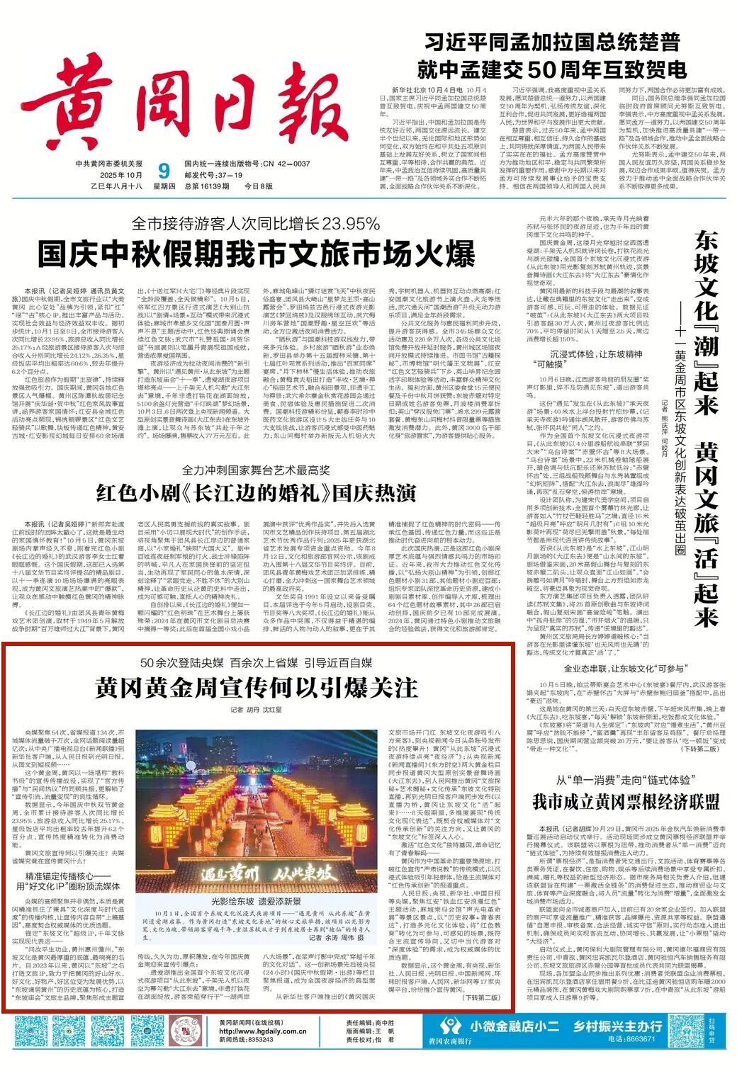 2025年国庆7天,央媒报道黄冈54次、省媒报道134 次、市域媒体流量破千万次,全网话题阅读量超亿次。黄冈市实施全域大文旅战略,十个县市区一起干,共同打造一个文旅超级IP——东坡庙会,常态化推出“庙会三宝”产品组合,推出原创音乐剧《大江东去》和“从此东坡”夜游项目,让“流量”变“留量”,叫响“大美黄冈、此心安处”文旅品牌。2025年全市接待游客量达到7400万人次,旅游总收入达到620亿元,同比增速分别达到15.01%、19.84%。