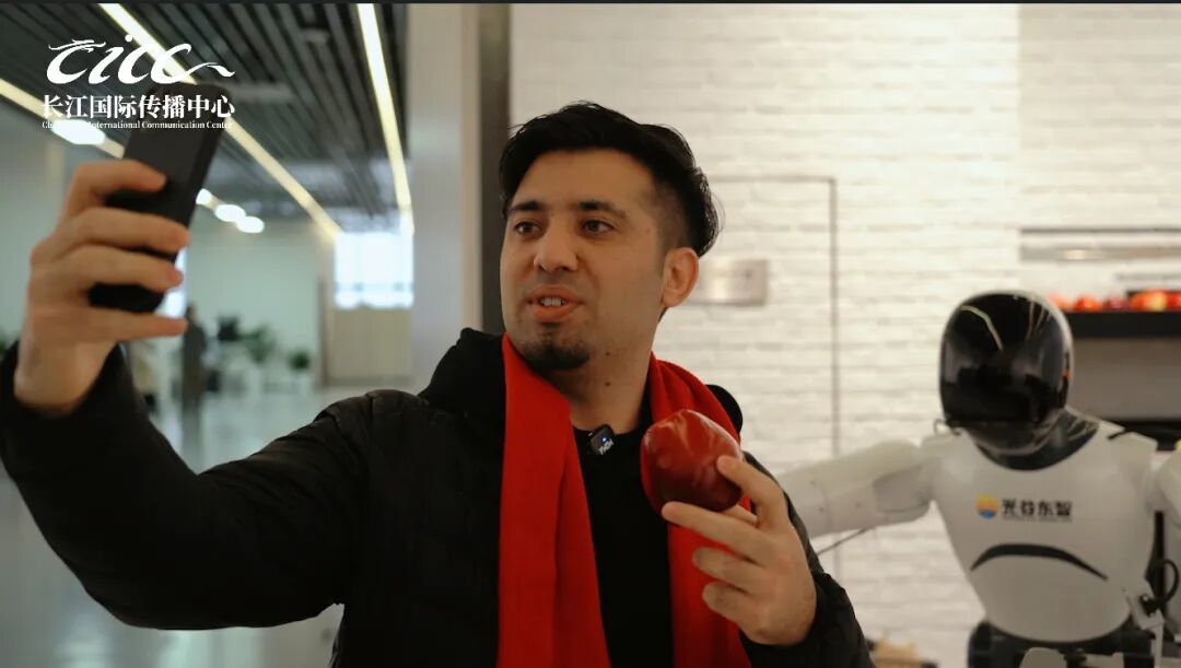 武汉大学巴基斯坦籍博士生尤纳斯接受湖北省人形机器人创新中心具身机器人送的“福”字