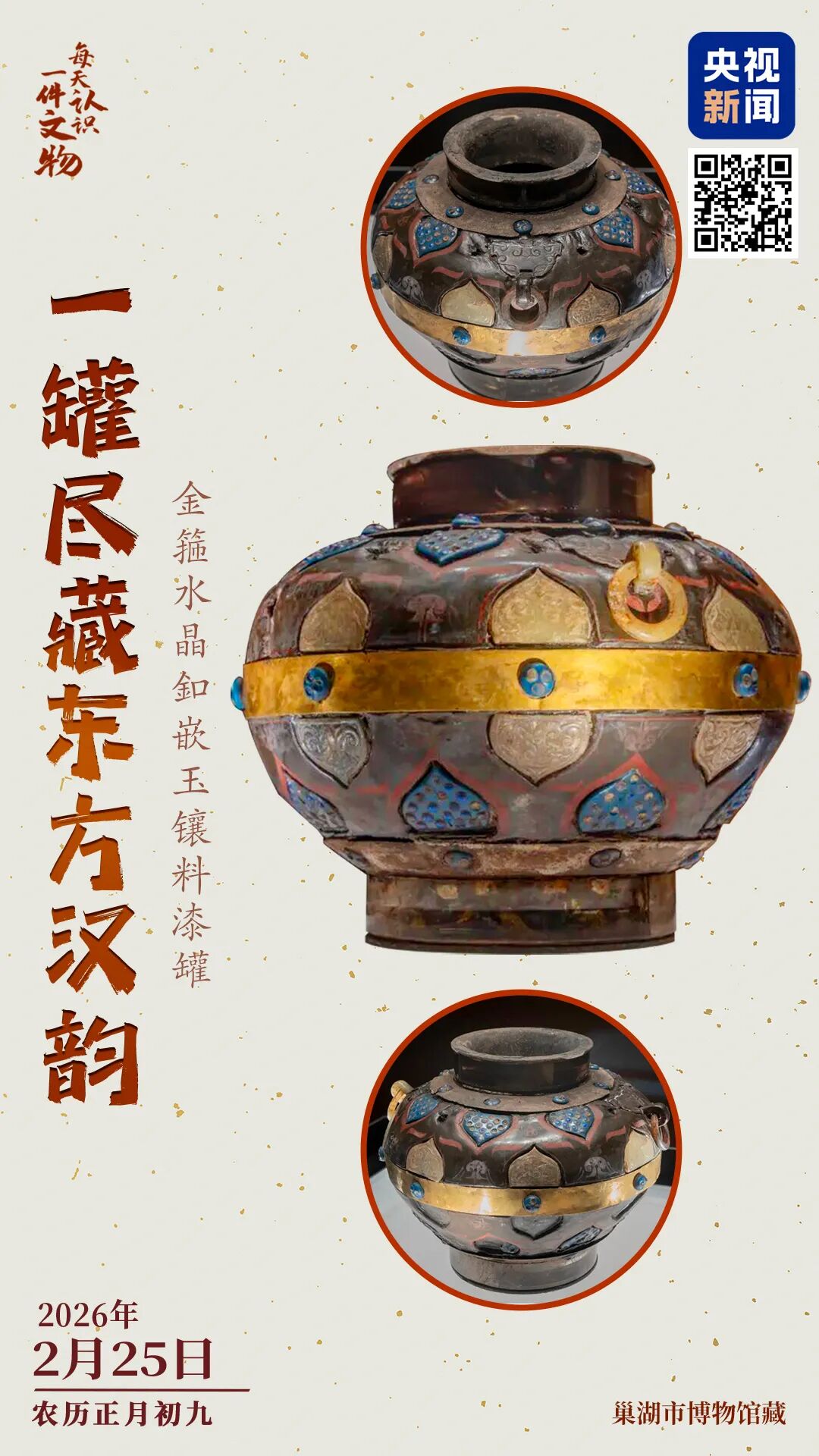 金箍水晶釦嵌玉镶料漆罐,集金、银、铜、玉、水晶、料器于一身,漆罐外镶嵌的水晶莹润、金箍耀目、青玉温润、蓝料明艳,堪称汉代“百宝嵌”工艺的杰出代表。器物上勾勒描绘着变形鸟兽纹,设计匠心独运,制作精细繁复,具有极高的工艺美学价值。