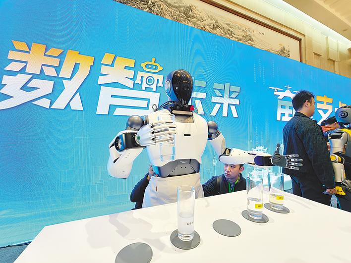 人形机器人展示抓取豆腐。(新华社发)