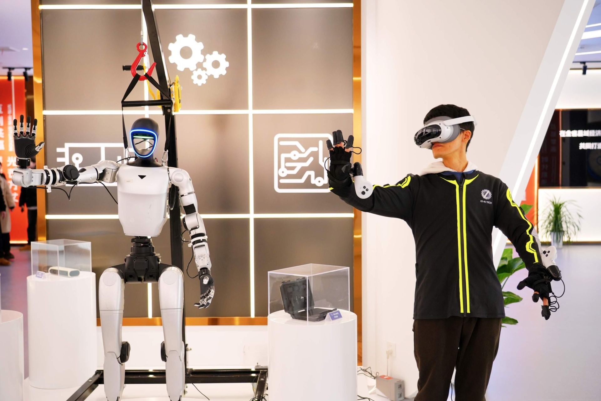 在潜江(武汉)离岸科创中心,湖北他山科技有限公司的技术人员在训练人形机器人。 通讯员关洪磊 摄