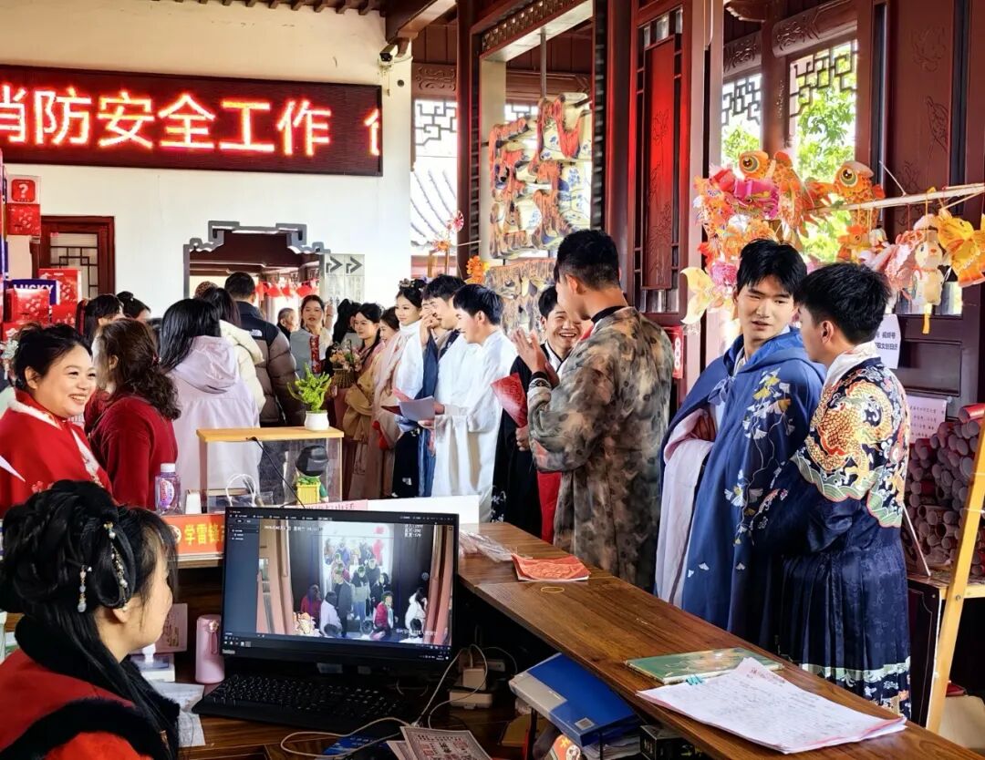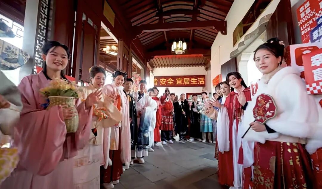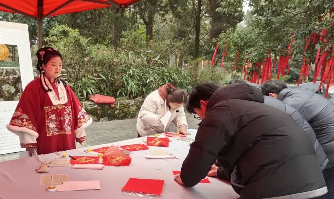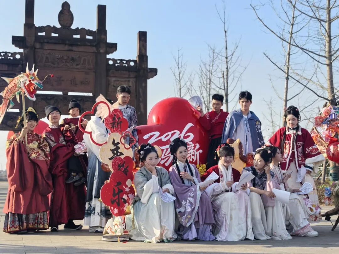 2026年春节,李时珍纪念馆凭借深度沉浸的互动体验火爆出圈。一是“大明蕲梦”汉服巡游成为流量核心。大年初一至初四,汉服NPC在全馆巡游,并不定时刷新《本草纲目》、《上春山》舞蹈及歌曲献唱等快闪表演。NPC与游客互动拜年,并随机赠送新年祝福挂历、李时珍纪念徽章、画展周边文创书签等好礼,所到之处皆引发围观与互动热潮,成为馆内最动人的流动风景线。