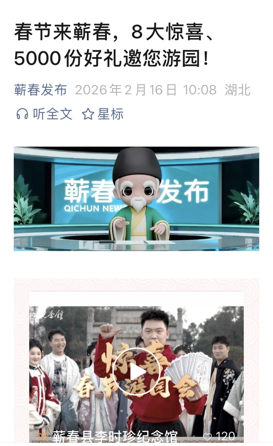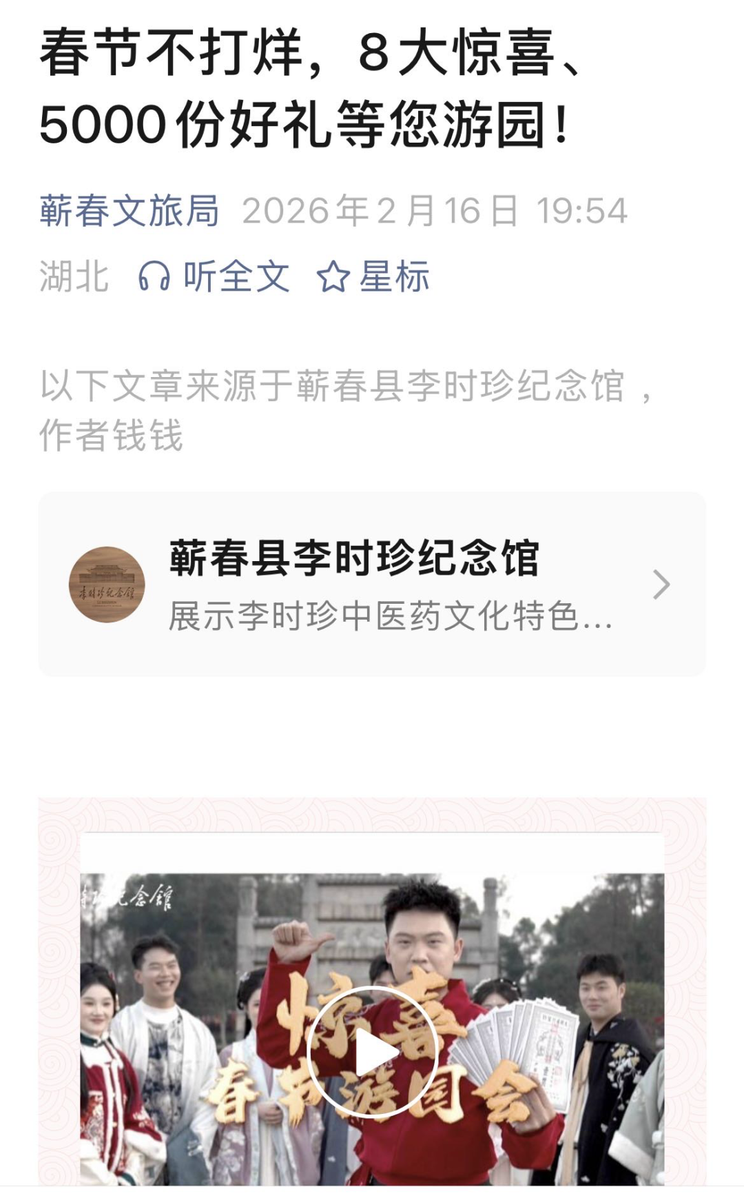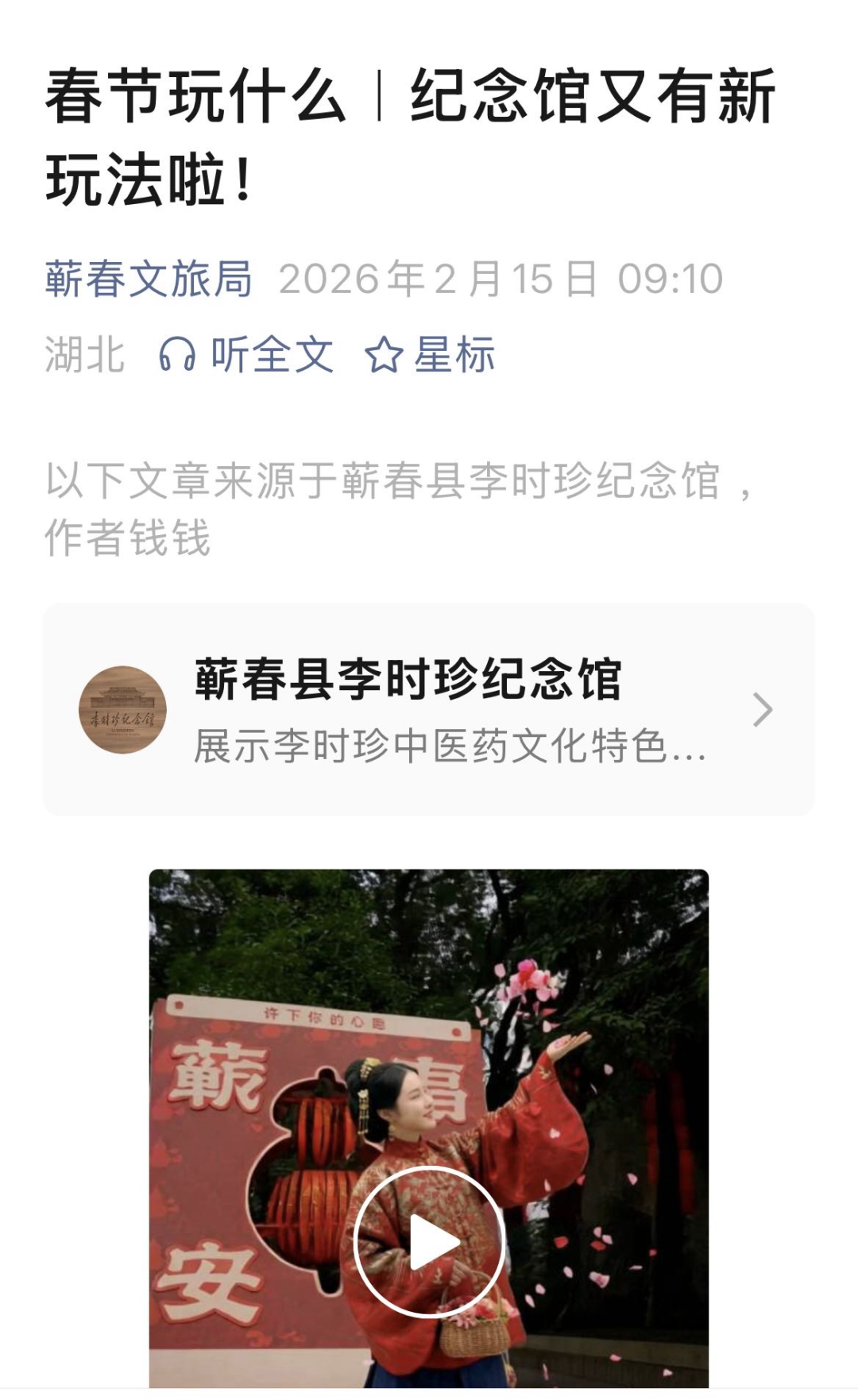 2月16日,蕲春发布报道李时珍纪念馆春节活动