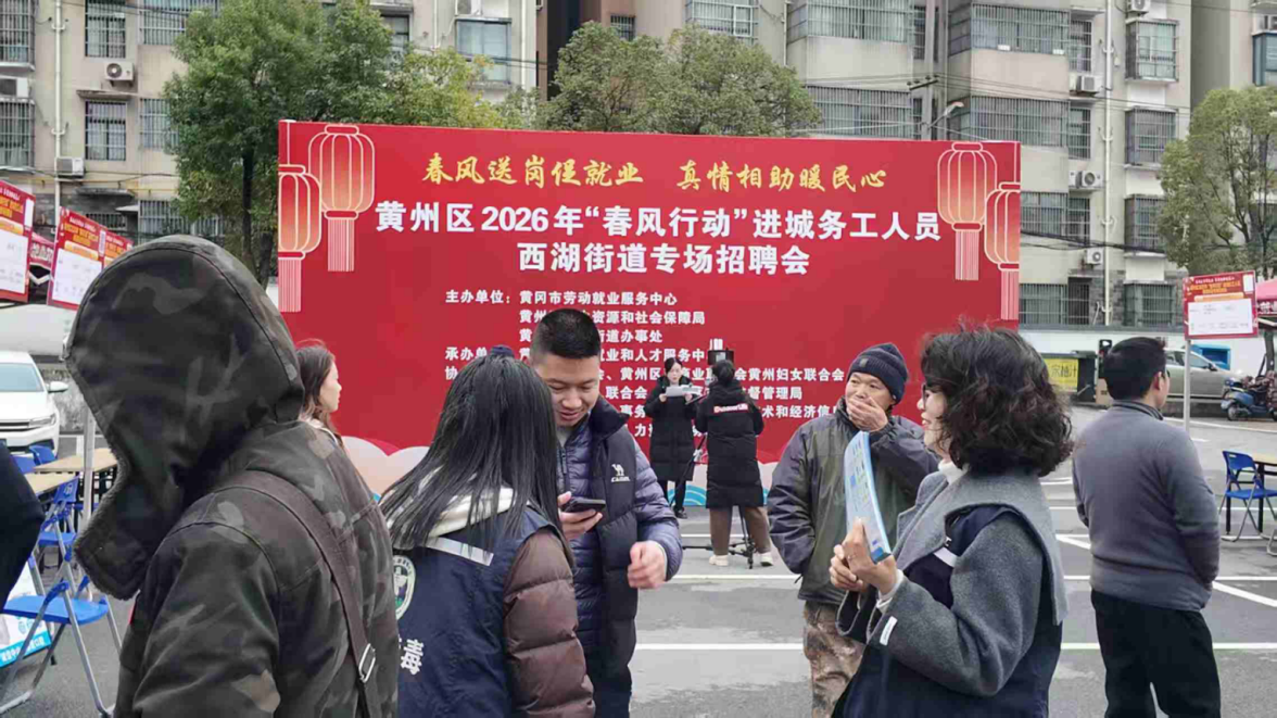 本报讯(通讯员熊长春 许琪)3月2日上午,黄州区2026年“春风行动”进城务工人员专场招聘会在西湖街道举办。活动以“春风送岗促就业,真情相助暖民心”为主题,采用“线下招聘+线上直播带岗”模式,精准服务进城务工人员、就业困难人员,重点助力辖区学校宝妈实现顾家、就业“两不误”。