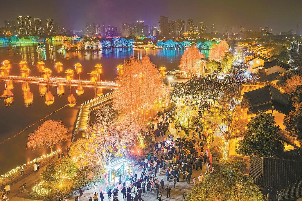 元宵夜,遗爱湖沉浸式夜游火爆,人山人海。记者 余涛 周伟 摄